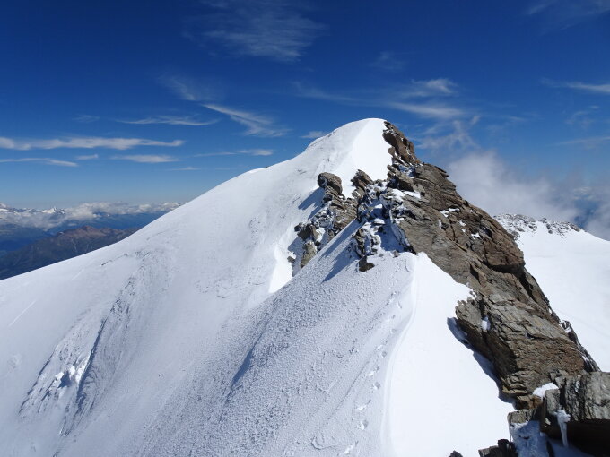 Am Fletschhorn gemäss Gipfelbuch heute vor mir noch eine grosse Gruppe der JO Blümlisalp, welche anschliessend den Lagginhorn N-Grat gemacht hat. Hätte mich auch gereizt, aber man kann halt nur einmal absteigen :-)
