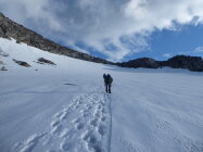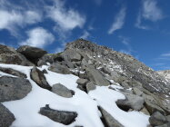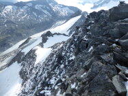 Von hier genau nordwärts in eine kleine Einsattelung (ca. 3100m) am Fuße des Grates.