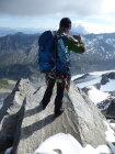 Von dort direkt dem Grat folgend (I-II), über 2 kurze Aufschwünge (II+ bis III-), zum Gipfel.