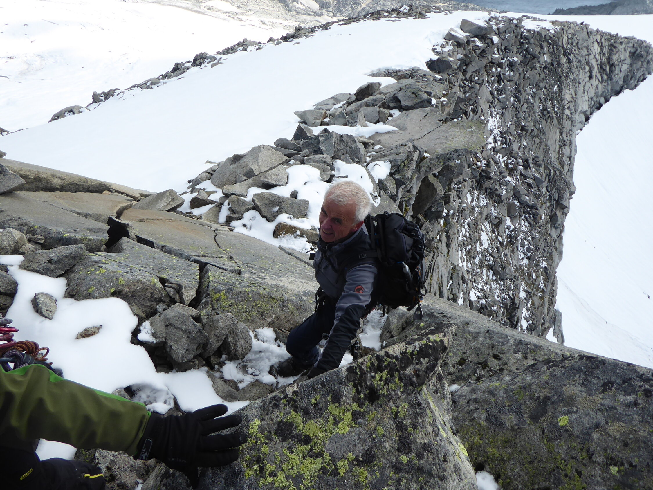 Obwohl des Grat von der Ferne schneefrei aussah, waren doch nordseitig vom Schneefall vom Vortag doch noch einige Schneeverwehung vorhanden, die das Klettern etwas mühsamer gestalteten.
