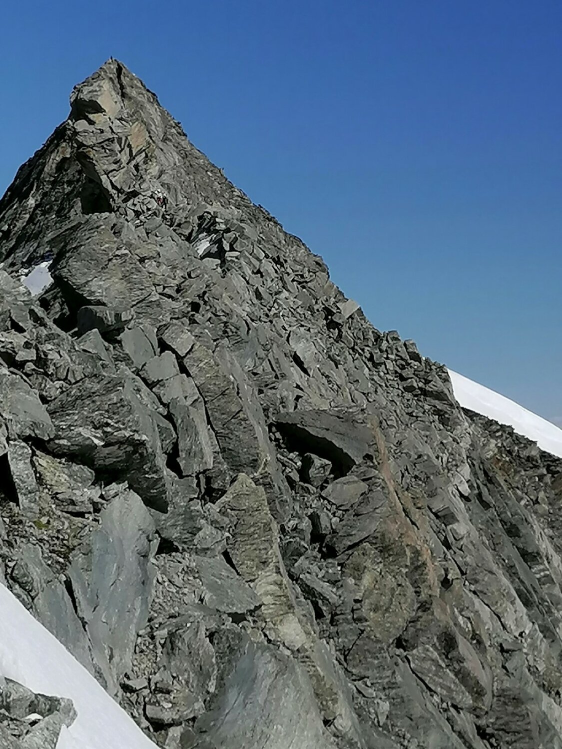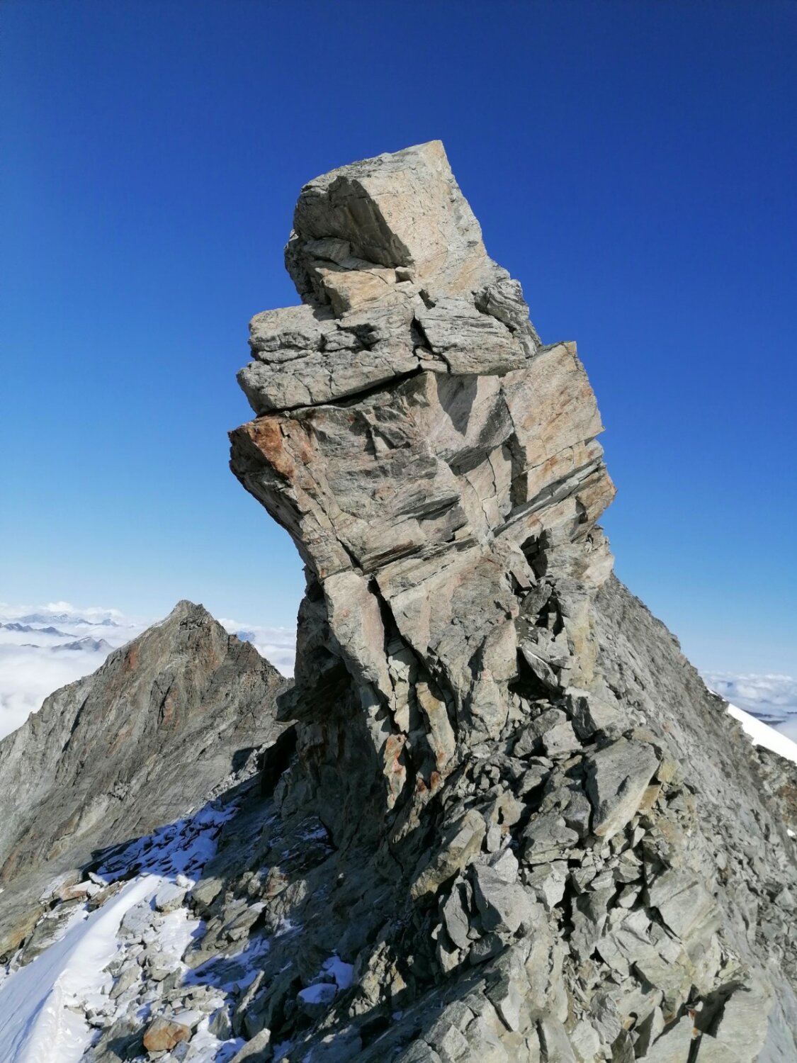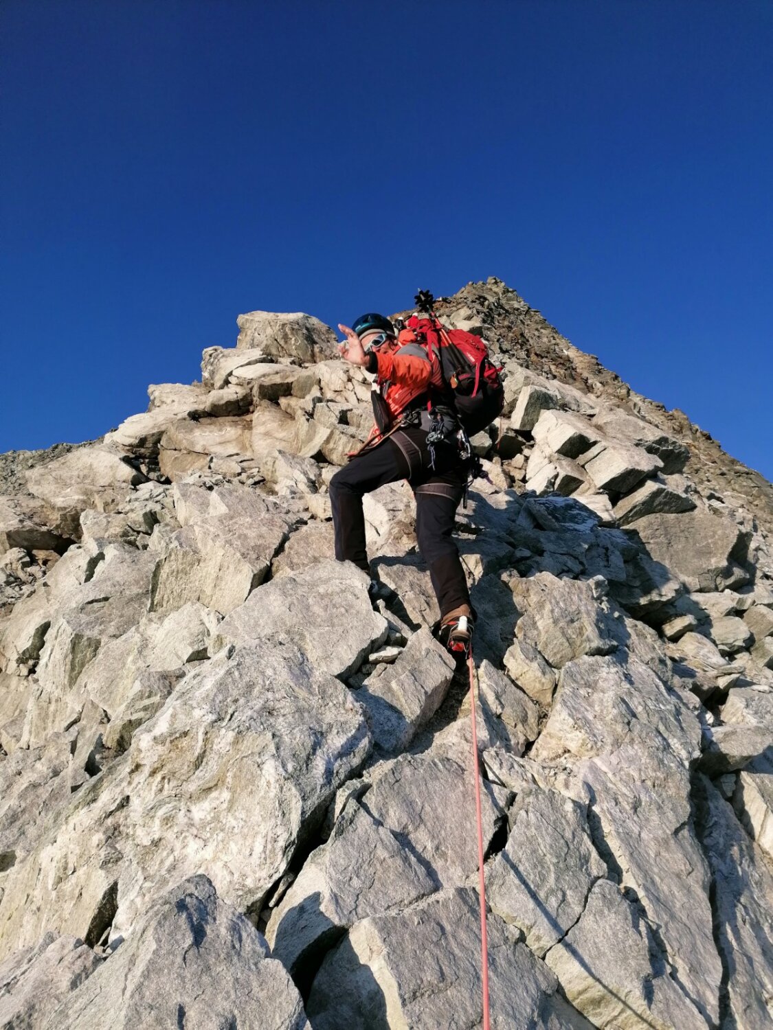 Der Abstieg in den Col des Rosses bietet eine wunderbare Felskletterei. Der markante Turm kann auf der Westseite auf einer schönen Felsplatte umgangen werden. D.h. es ist ein Quergang der mit zwei Bohrhaken ausgerüstet ist.