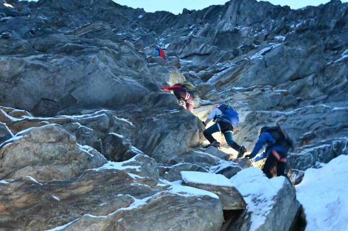 In der Nacht von Samstag auf Sonntag fielen oberhalb von 3500m ca. 10cm Neuschnee. Aufgrund des starken Windes wechselten sich Passagen mit Triebschnee und abgeblasene Teilstücke ab. Die Felsen hoch zum Festijoch und am Beginn des Festigrats waren z.T vereist, sollte aber in den kommenden Tagen abtrocknen. Die Firnpassagen sind grossteils noch gut zu gehen, lediglich um den ersten Gratturm sowie in der ersten Steilstufe oberhalb des Felsgrats beginnt es auszuapern.
