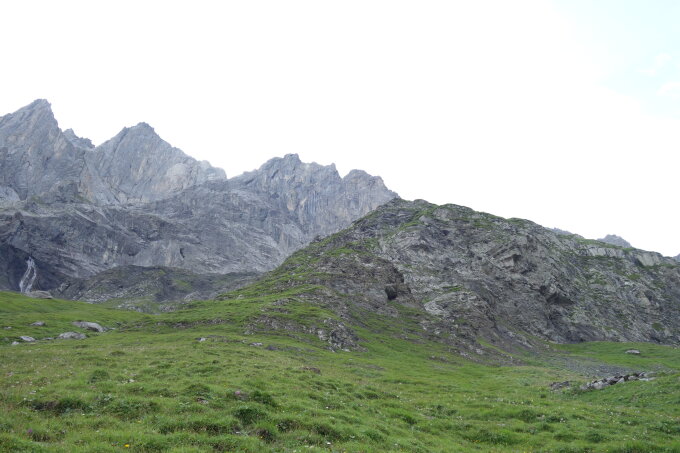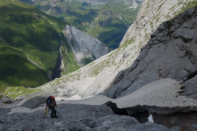 Start Dank vorhergehender, kurzer Regenschauer um 9:30 in Wichlenberg. Entgegen der Vermutung waren die Grasshänge nicht durchnässt sondern nur am Anfang etwas feucht. Mit Steigeisen und Pickel sehr guter halt. Routenfindung zum erstaunen recht intuitiv, jedoch keinerlei Spuren oder Steinmänchien. Bis zum Einstieg vom Kessel auf festem, kurzen Grass, max. 35-40°. Dann sieht man die ersten 2 Bohrhaken, anschliessend 10m Abklettern/ Abseilen an einem neuen Stand.