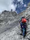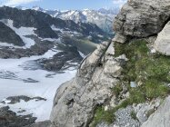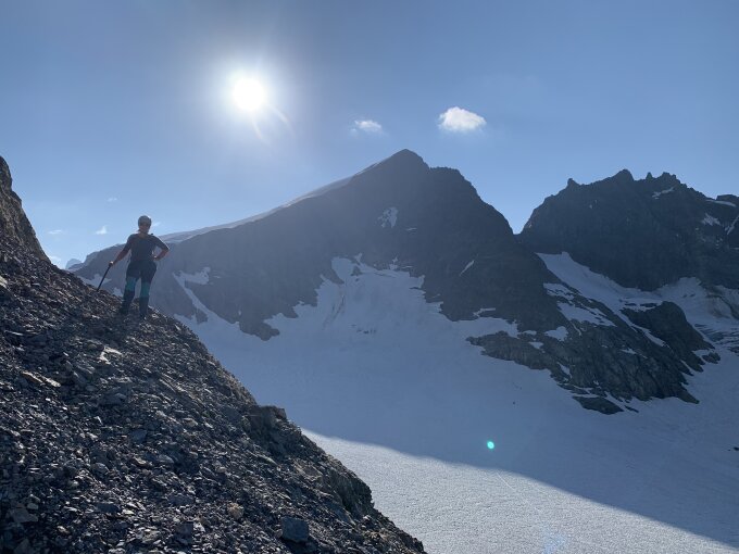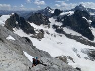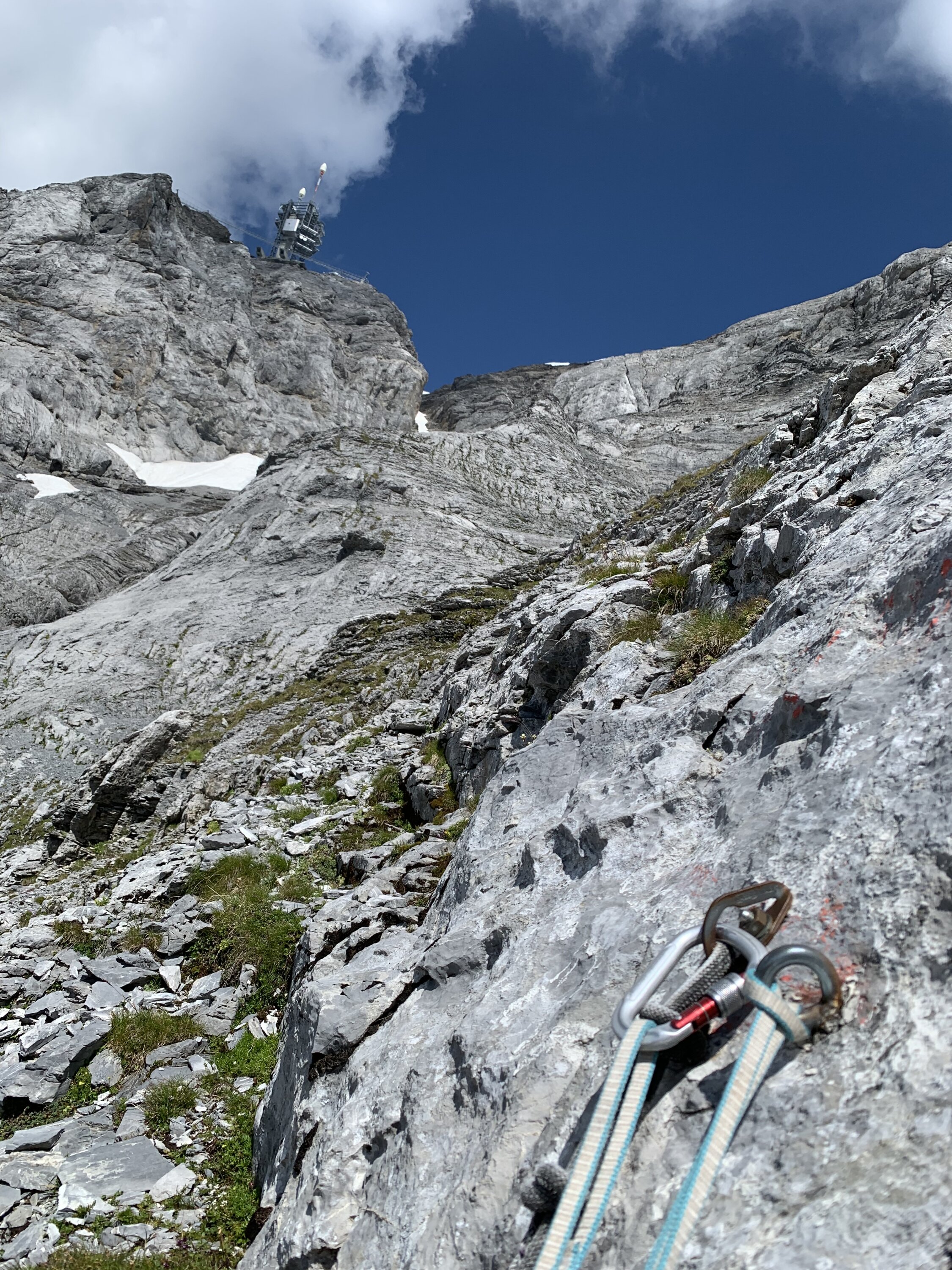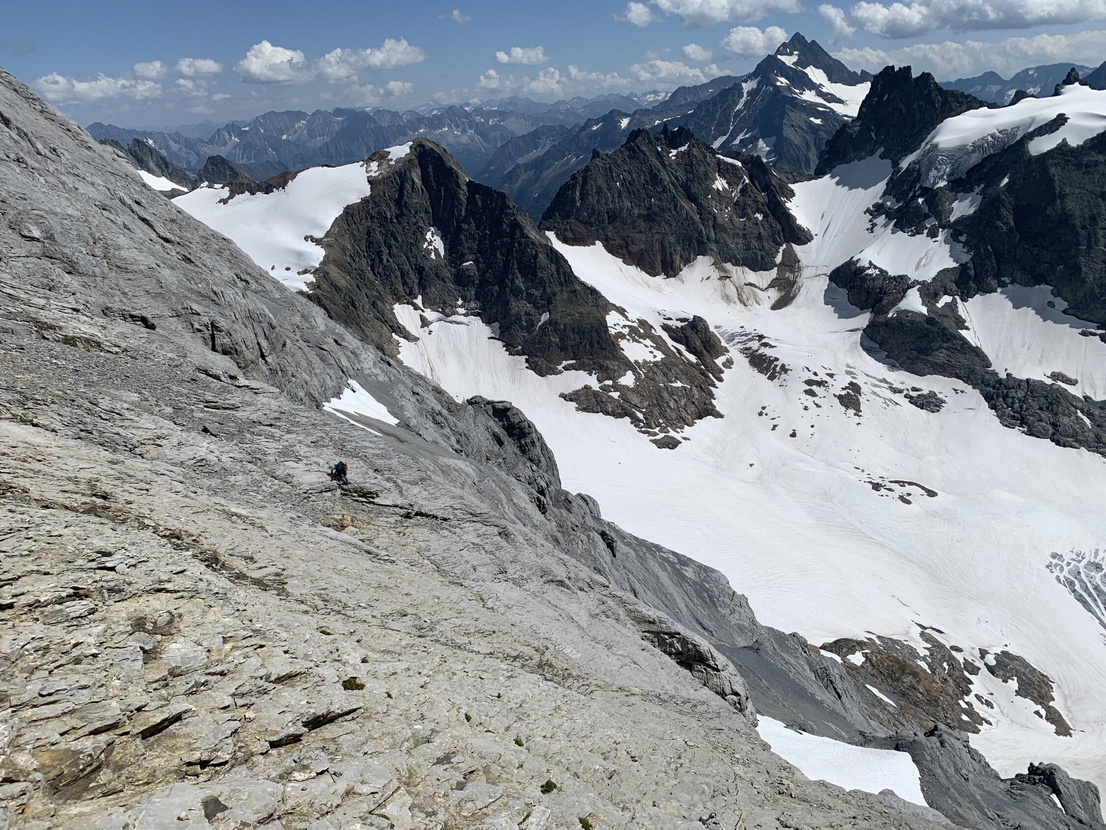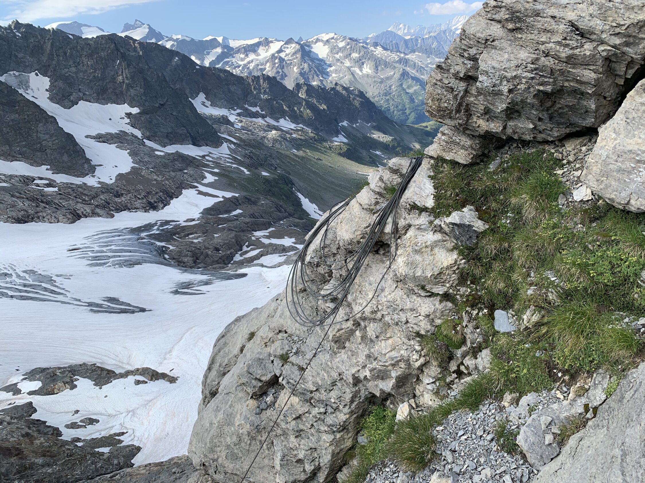 Es liegt viel Schotter in der Route. Das erste Drahtseil sollte nicht als Sicherung benutzt werden, da es nur um einen kleinen Felskopf gelegt wurde. Zur Routenfindung dient es allerdings super. Allgemein ist das finden der perfekten Linie das schwierigste der Tour. Wir benötigen 7:20 ab Grassenbiwak mit 10SL und Gehgelände im T6 mit immer wieder Pausen. Das Schneefeld vor den drei Leitern ist nicht mehr gross. Eine Seilsicherung zu empfehlen und auch möglich. Ein Ausrutschen auch bei Felsschrund wäre fatal. Die Leiter wie auch die nachfolgende Drahtseile sind in einem guten Zustand. Bei den letzten Drahtseilen am besten die alten Klettersteig Sicherungen links folgen bis zum Ausstieg und Ende der Route.
