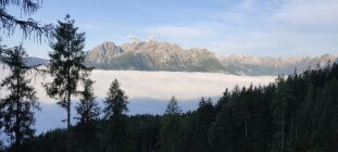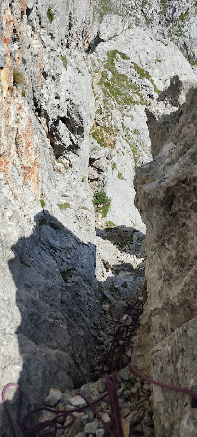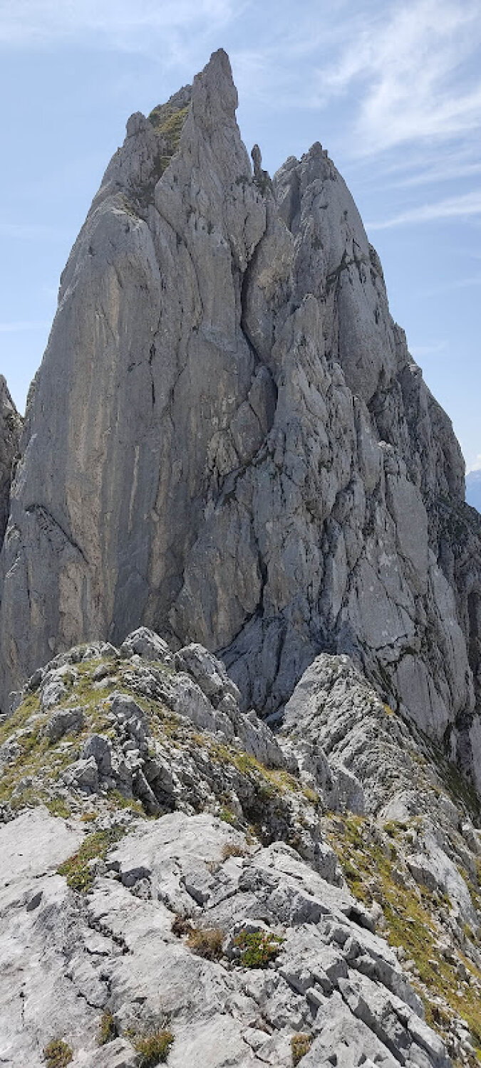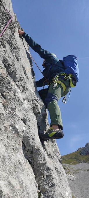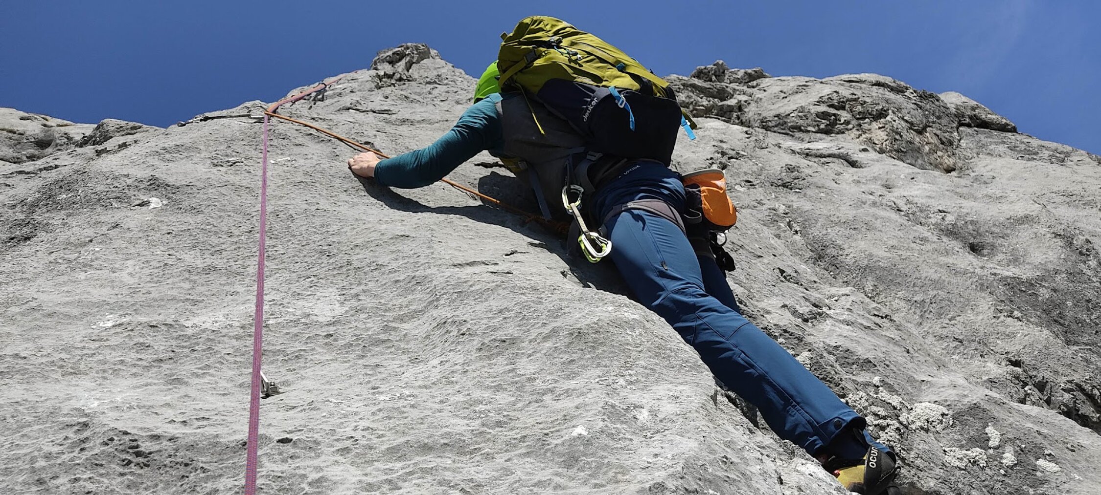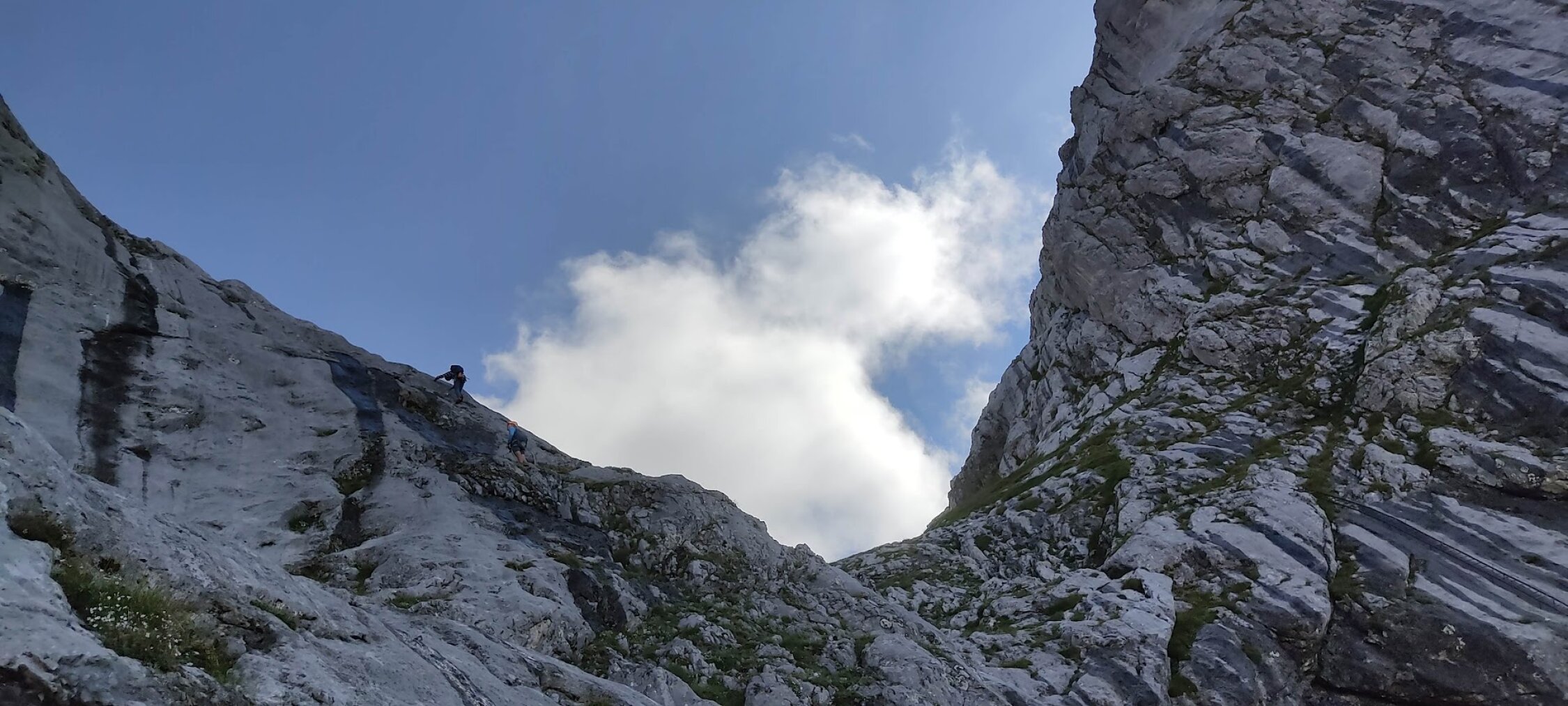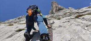 Premium-Plaisirtour in bestem Fels, die man sich nicht entgehen lassen sollte. 10 SL, die meisten davon im 4. Grad, jeweils eine 5 bzw. 6+ (4+ obligat). Lediglich der Abstieg über den leicht exponierten Grat ohne Markierungen nach links mit z.T. rumliegendem brüchigem Fels, die zwei nicht ganz leicht zu findenden Abseilstellen und die z.T. exponierte Querung über das Grasquerband und die Thorleiter zurück zum Einstieg entsprechen nicht ganz einer Plaisirtour. Mit der nach Auskunft anderer Kletterer frisch eingerichteten Abseilpiste am Grat rechts vom Ausstieg gibt es aber wohl inzwischen eine komfortable Alternative. Über die Tour selbst sollte wegen Schutt auf Bändern nicht abgeseilt werden wegen Steinschlaggefahr.