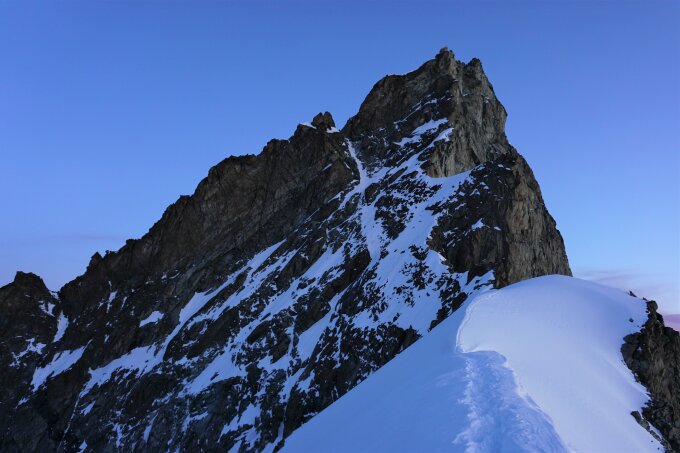 Zustieg bis ca. 3750m ohne Steigeisen gut möglich (griffiger Schnee, gute Spur). Das Couloir zur Gabel hatte durchgehend Schnee und war gut zu gehen. Allerdings gibt es in der Querung in das Couloir eine längere Passage die keine Fixpunktsicherung zulässt (>50m). Daher haben in letzter Zeit lt. Hüttenwirtin immer wieder Seilschaften umgedreht. Am Grat selbst gab es noch Einiges an Schnee, daher durchgehend mit Steigeisen zum Gipfel. Kletterei an sich aber unproblematisch. Trotz des frühen Abstieges war der Schnee im Couloir schon etwas weich.