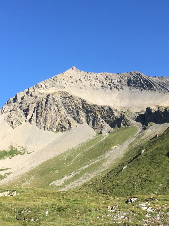Immer wieder schöne alpine Tour in schöner Umgebung mit Blick zur imposanten Südwestflanke des mächtigen Piz Üertsch 3267 m. Im Abstieg habe ich einen Mountainbiker auf etwa 2500 m angetroffen. Habe ihn gefragt ob das Spass macht das Velo 700 Höhenmeter zu stossen und zu tragen. Ich persönlich finde es nicht toll, dass alpine und steile Wege von Bikern benützt werden, fahren können sie auf dieser Strecke nicht und ausweichen ist auch nicht immer einfach.