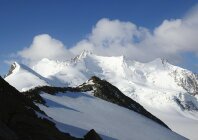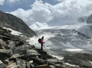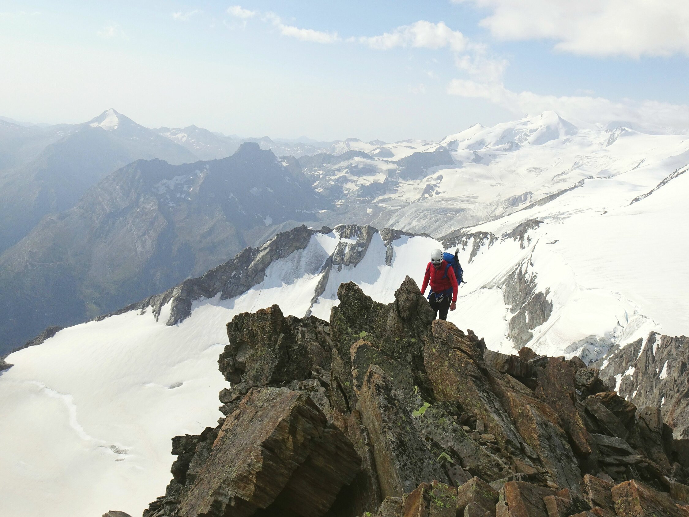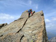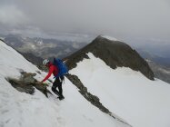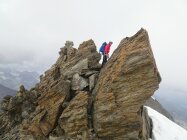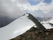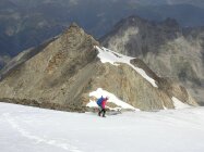 Gratüberschreitung dann bestens, Fels trocken mit netten Kraxeleinlagen, allerdings nicht immer ganz fest. Streckenweise führen Trittspuren unterhalb des Grates entlang. Zwischen Balfrin Haupt- und Nordgipfel noch kurze Schneepassagen, die aber weich und gut zu begehen waren. Der Firnhang, der vom Nordgipfel hinunter zieht, wird nach unten hin zunehmend steiler und eisiger. Es empfiehlt sich daher, nach dem ersten flachen Schneefeld nach links zum Grat zu queren, wo Steigspuren im Geröll zum Balfrinjoch führen.