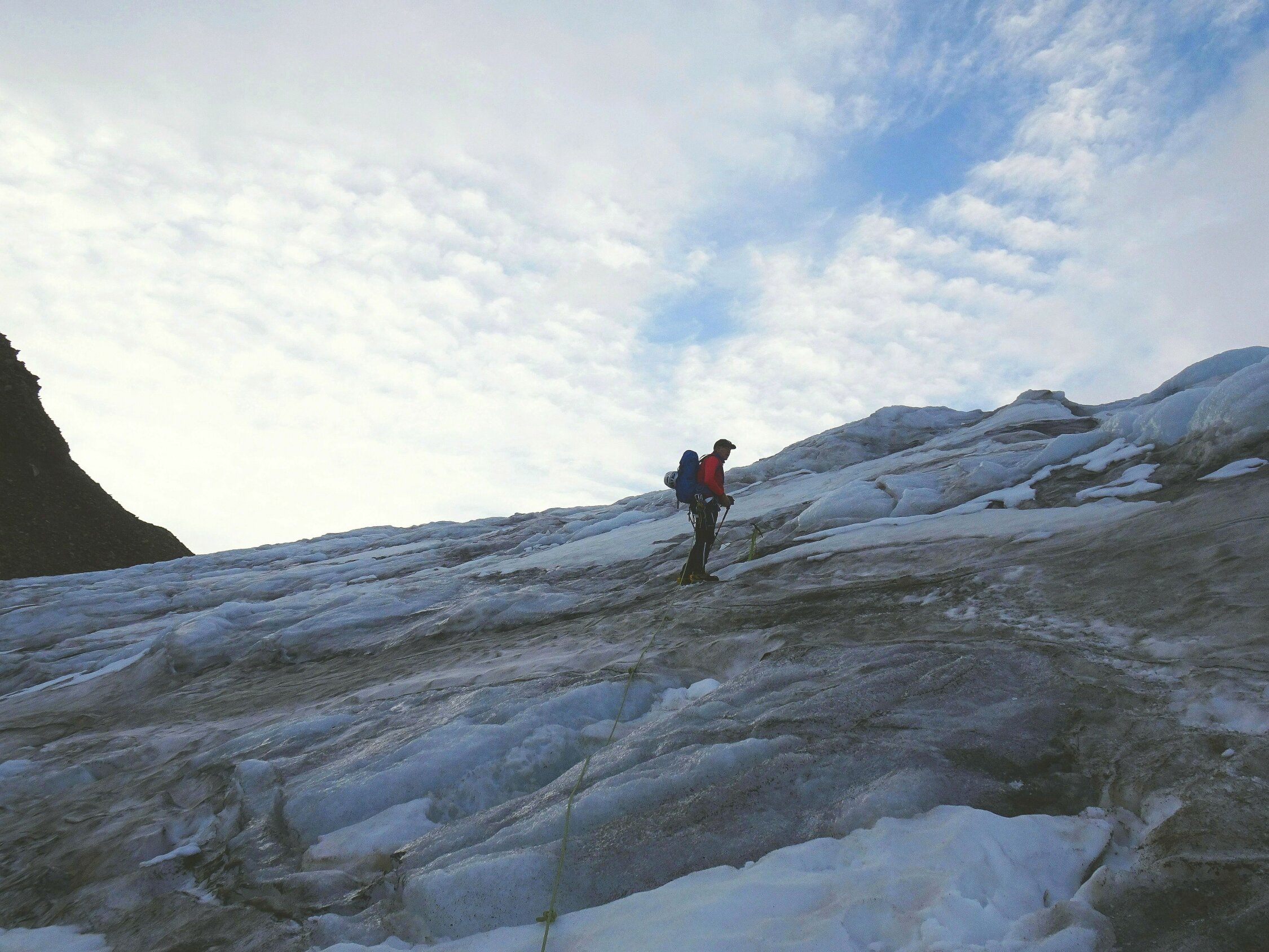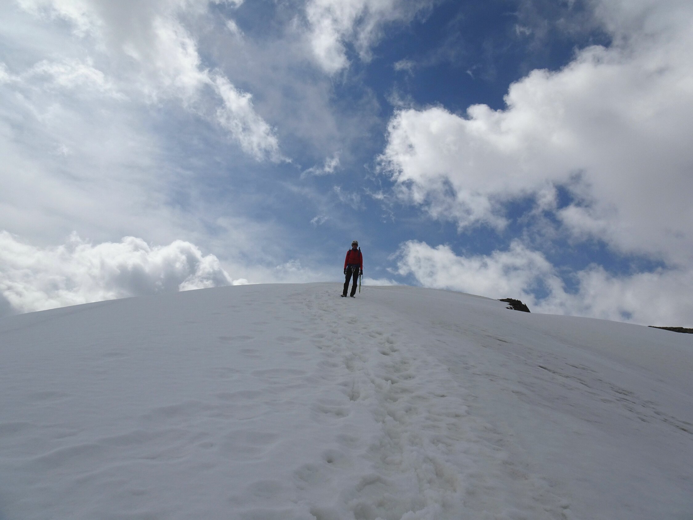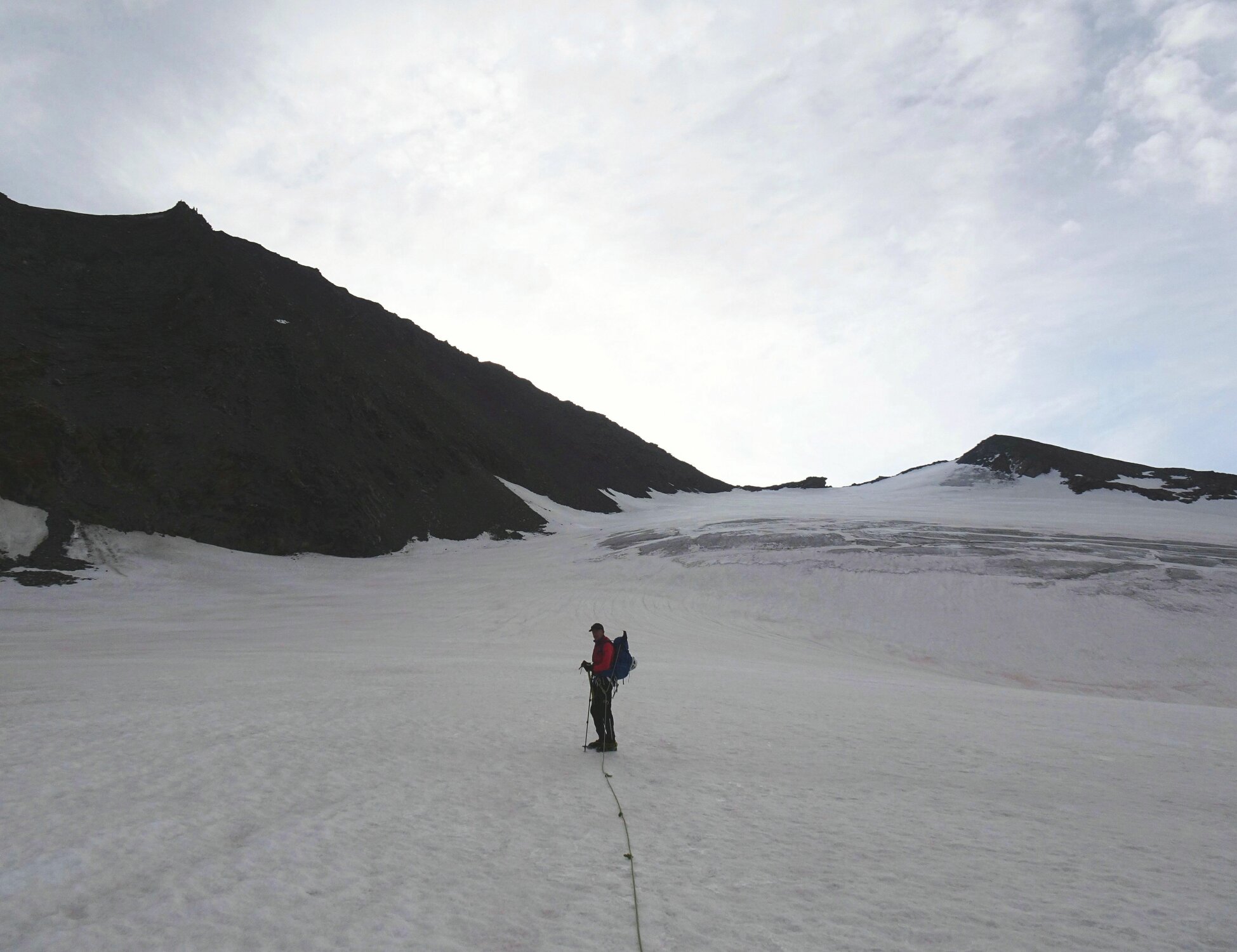 Am Freitag nicht ganz so perfekt wie an den Tagen zuvor. Nach nächtlichem Gewitter und wenig Abstrahlung Schnee nicht gefroren. Gletscher im unteren Bereich teils aper, aber griffig, oberhalb der Bruchzone dann teilweise tragend, teilweise knietief eingebrochen. Etwas mühsam, zudem einige Spalten lauern.