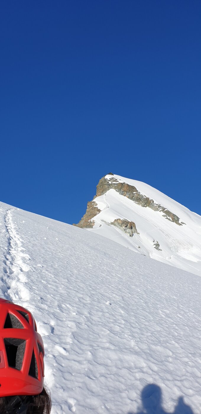 Besser bekommt man den Hohlaubgrat wohl kaum. Sehr gute Spur. Einzig eine Stelle unten am Grat etwas eisiger als man es gern hätte, dort aber noch wenig ausgesetzt. Wir sind allerding schon ab so 3100 auf die Felsen links und die bis so 3500 hochgekraxelt (siehe Bild mit roter Linie). Schien uns spaßiger als den langen Gletscherumweg (der ist aber bestimmt bei den Verhältnissen genauso schnell...)
