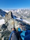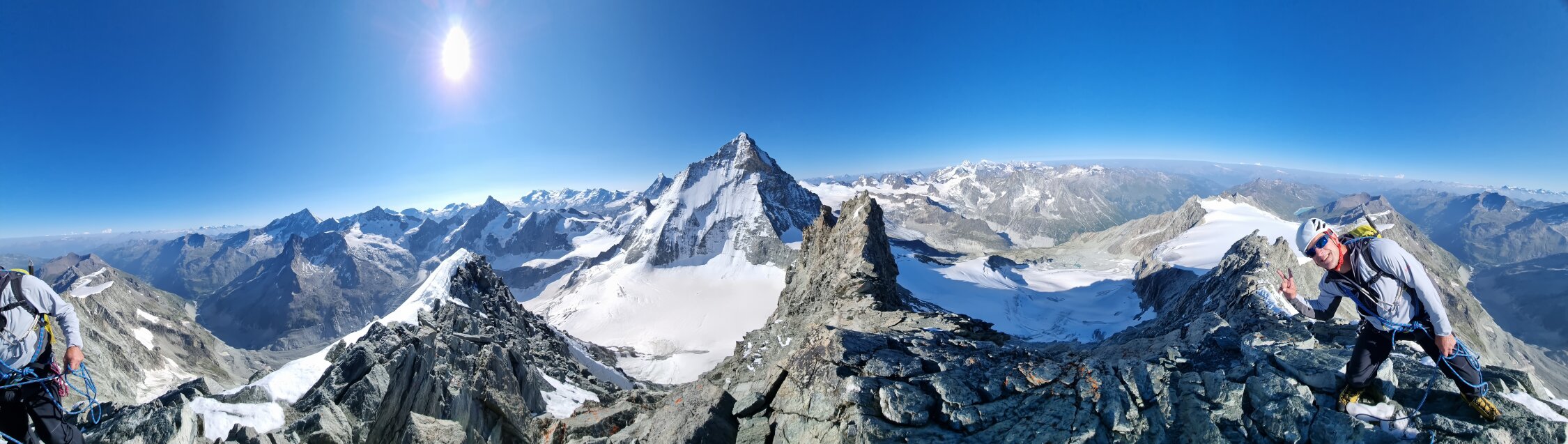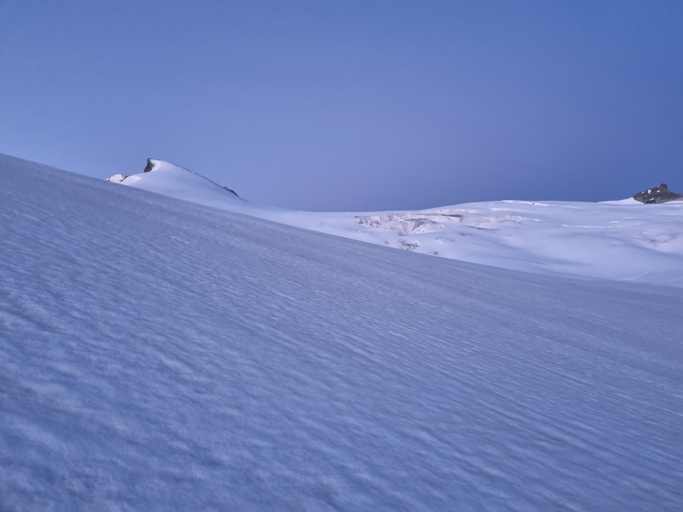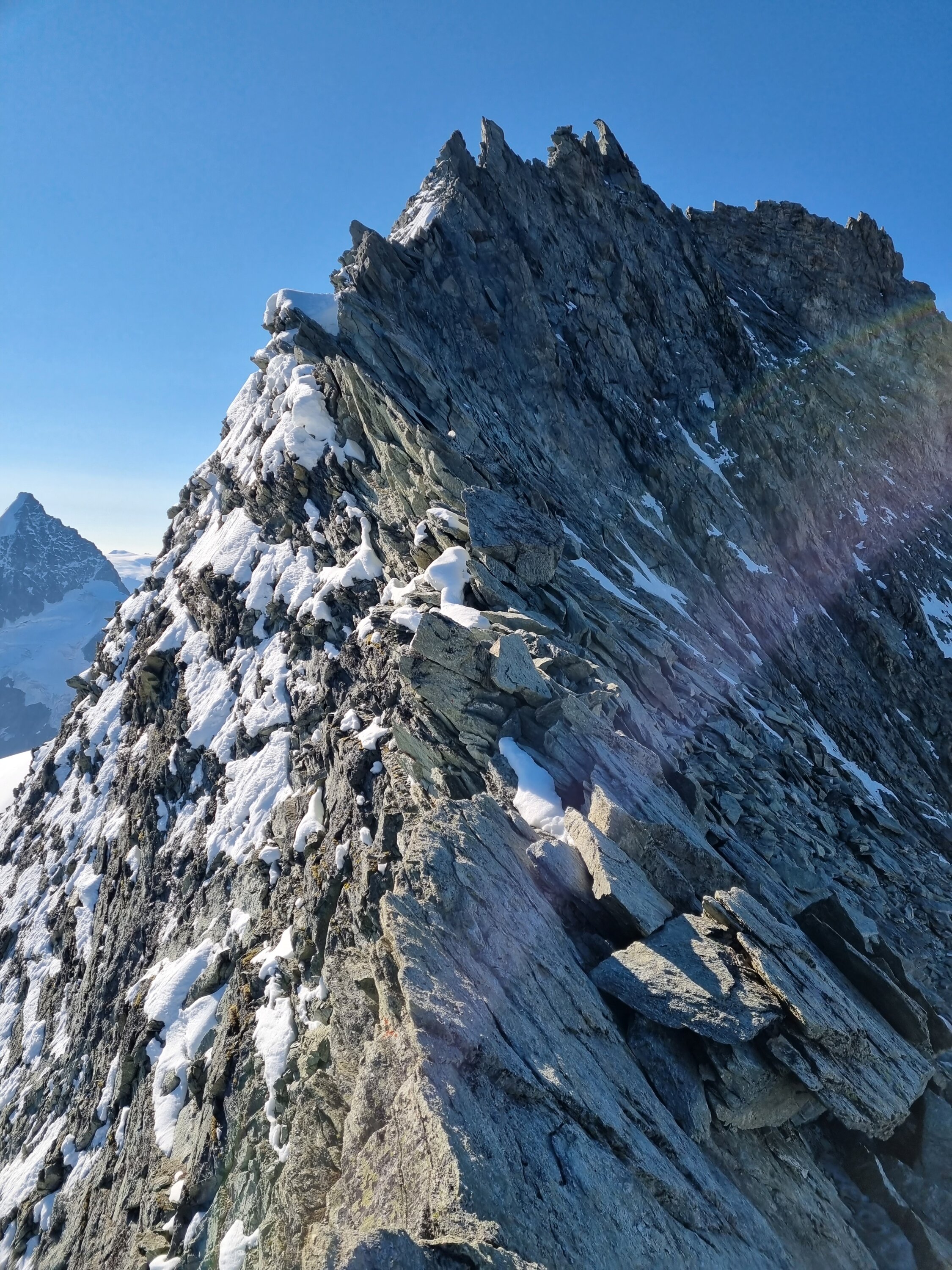 Gletscher ( und Spalten) noch mit relativ viel Schnee- spätestens um 3 uhr in Hütte starten, sonst ist der Gletscher- Rückweg mühsam und heikel. Das Eis am Einstieg Grand Cornier kommt nach den Regenfällen langsam durch- Eisschrauben von Vorteil. Grat z.T. noch mit Schnee, ist aber gut ohne Steigeisen machbar. Tolle einsame Tour und super Essen in der Cab. De Moiry!