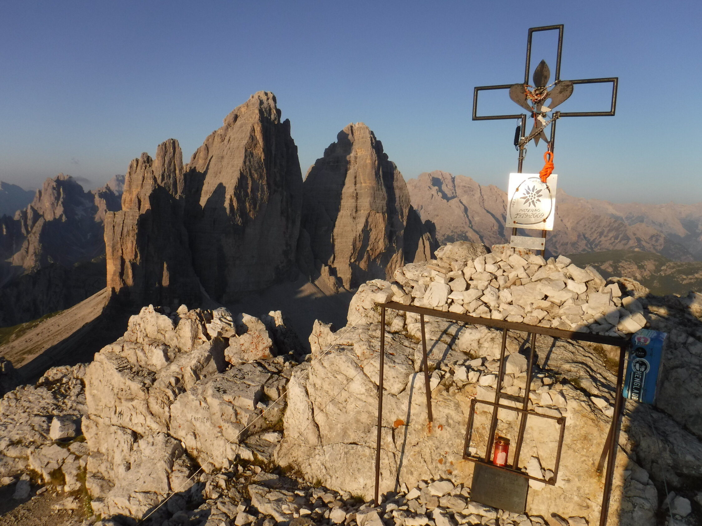 Aussichtsberg als Triumvirat per excellence mit Blick auf die nahen senkrechten Nordwände der Drei Zinnen (2999 m). Vom Holzkreuz sieht man hinab zur Dreizinnenhütte mit den beiden Bödenseen (Lago dei Piani) und hinüber zum Paternsattel, so dass man bei schönem Wetter viele Wanderer unterwegs sieht. Und man sieht hinüber zum Toblinger Knoten, dahinter gestaffelt: Schwabenalpenkopf, Schwalbenkofel, Bullköpfe, Hochnebenkofel und Haunold im Norden. Links davon die 3145 m hohe Dreischusterspitze, schräg dahinter die Tauern mit dem Großglockner. Im Osten sieht man auf die Breitseite des Zwölferkofels. Links schließen sich die 3000er an: Hochbrunnerschneid und Elfer, sowie die Sextener Rotwand. Dahinter verstecken sich die kaum bekannten und nicht ganz so hohen Gipfel im „Wilden Osten“ der Sextener Dolomiten.