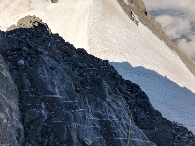 Abkletterstelle vom Le Dôme problemlos, es sind zwei Fixseile installiert. Gletscher noch sehr gut eineschneit, keine Spalten sichtbar.