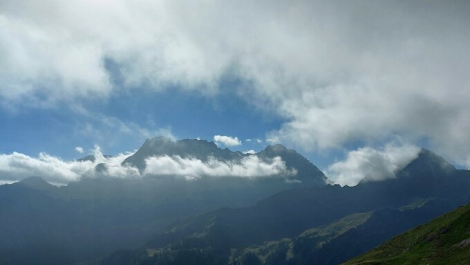 Nach Mittag bildete sich eine geschlossene Hochnebeldecke um die Pfälzer Hütte. Am Gipfel vom Naafkopf dagegen Aufhellungen. Ausser Hinter und Vorder Grauspitz und Glegghorn waren kaum Gipfel zu sehen.