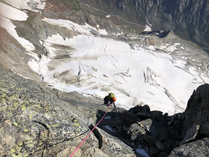 Sehr gute Verhältnisse! Im Gegensatz zu anderen Jahren sind die Gletscher auch Mitte August sehr wenig ausgeapert, infolgedessen sehr angenehmes, kräftesparendes Steigen bis an den Einstieg. Der erste Abschnitt der Kante ist leider wirklich brüchig, aber auch nicht schwierig. Mit der ersten schwierigen SL (4c) ändert sich der Charakter komplett. Es überwiegt tolle Kletterei in meist sehr gutem Fels. Obschon ein paar alte Schlaghaken stecken und die Stände neu gebohrt sind, bleibt die Kletterei doch recht fordernd. Das Ambiente ist hochalpin, und die Kletterei für eine klassische Tour bemerkenswert steil. Erst beim oberen Klemmblock wird das Gelände wieder brüchig.