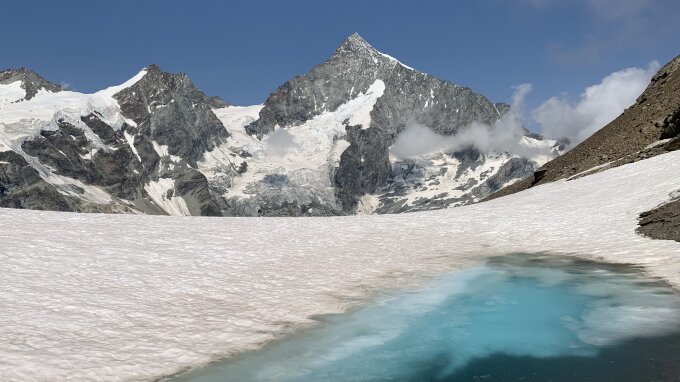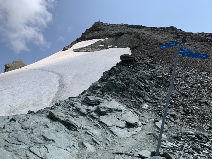 Wenn das Wetter warm bleibt, könnte der Firn wegschmelzen. Mit den Steigeisen im Rucksack ist man auf der sicheren Seite.