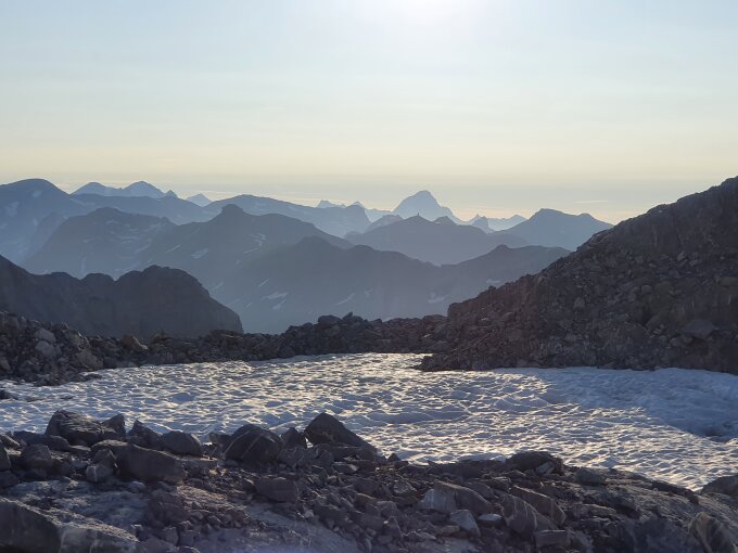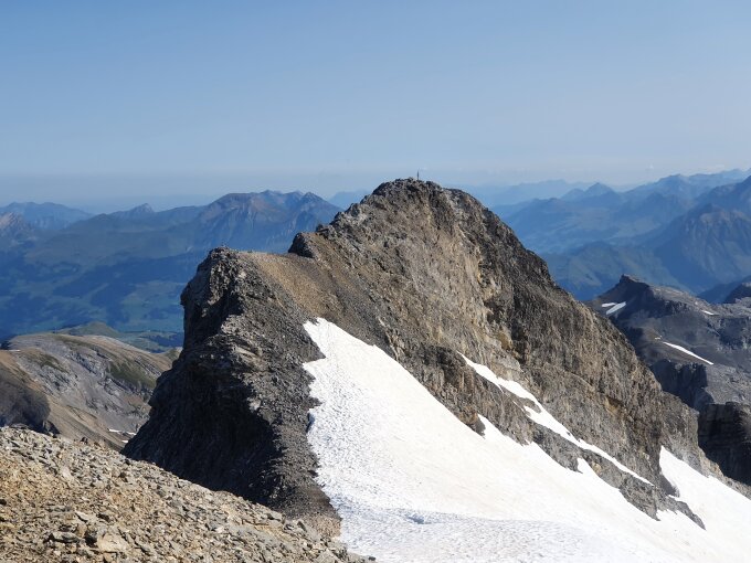 Die Aussicht vom Gipfel ist atemberaubend. Vom Wetterhorn, Eiger, Walliser, Mont Blanc bis zu den Diablerets. Nach einem Picknick haben wir uns spontan dafür entschieden, über einen kurzen Felsgrat auf den Sattel ab- und von dort über Schnee auf die Kuppe des Westgipfels aufzusteigen. Es war einfach zu schön da oben, um sich schon gleich wieder an den Abstieg zu machen.