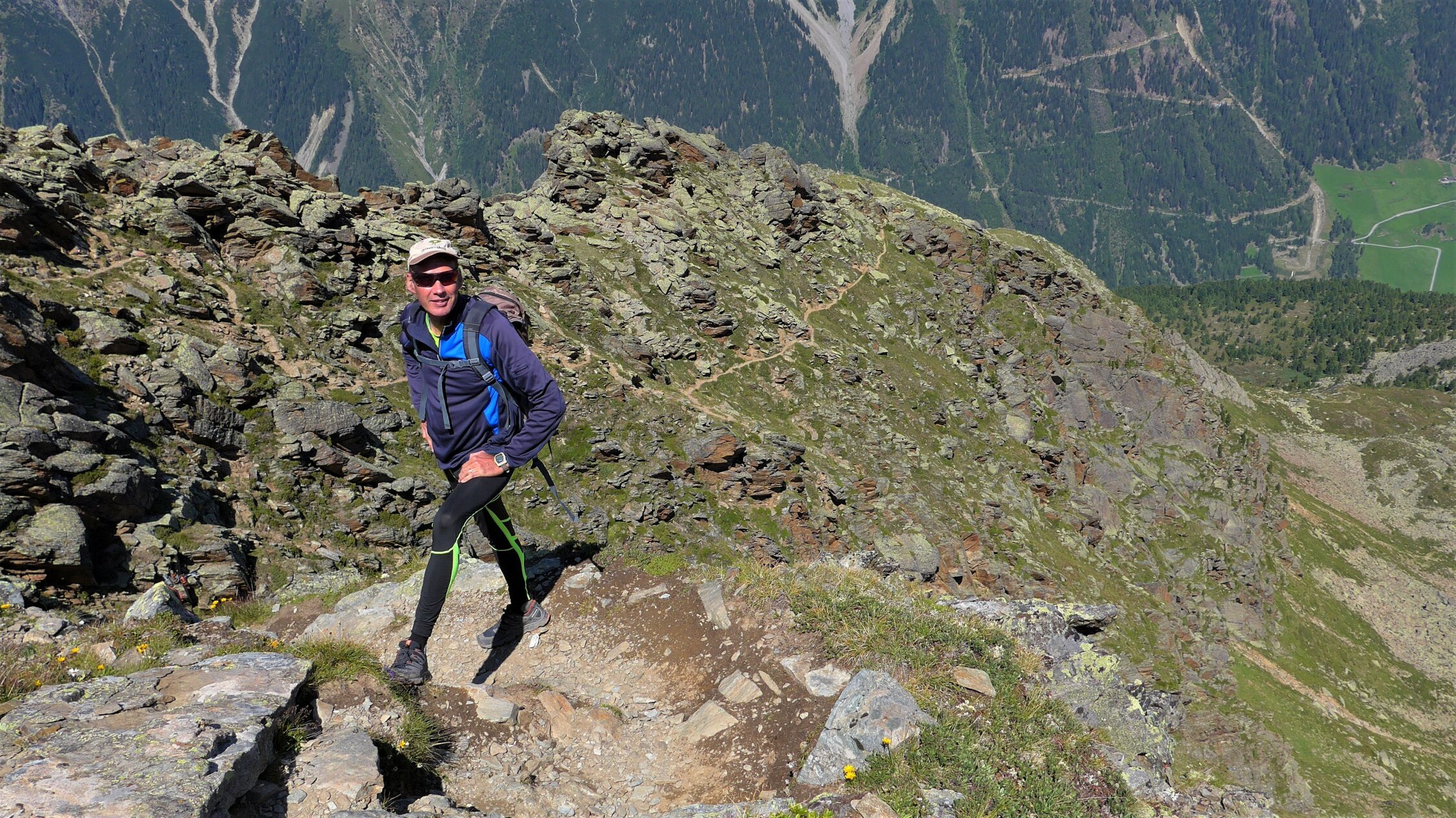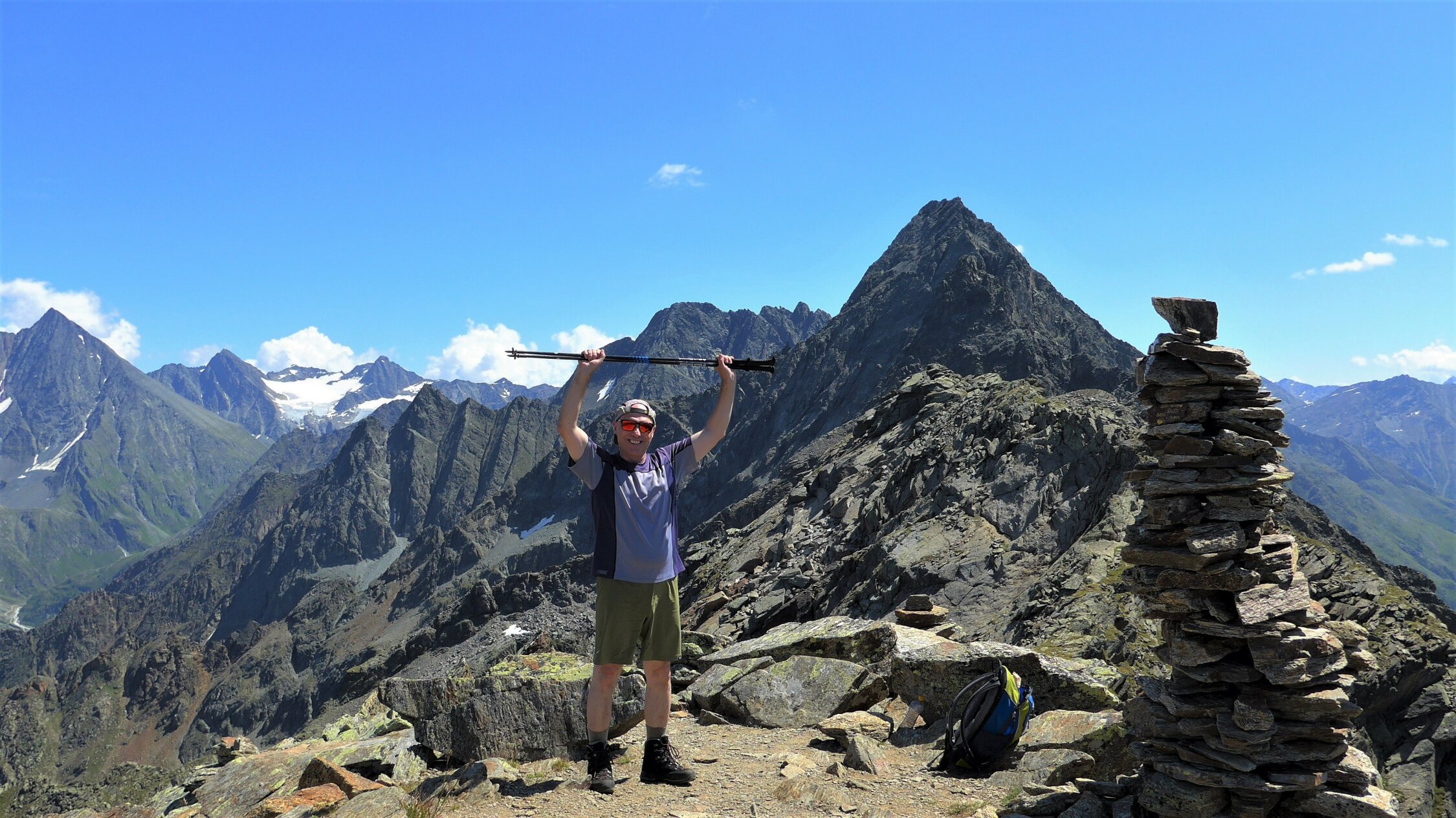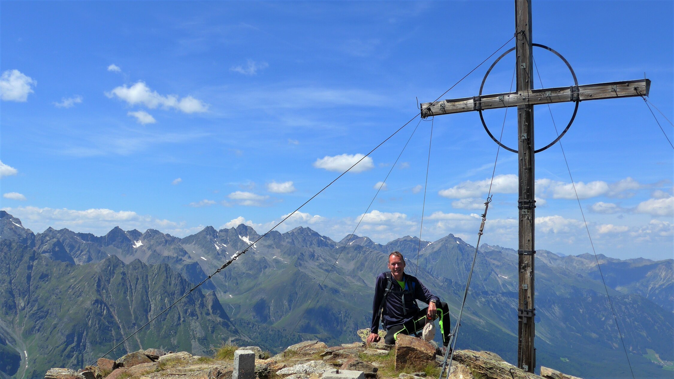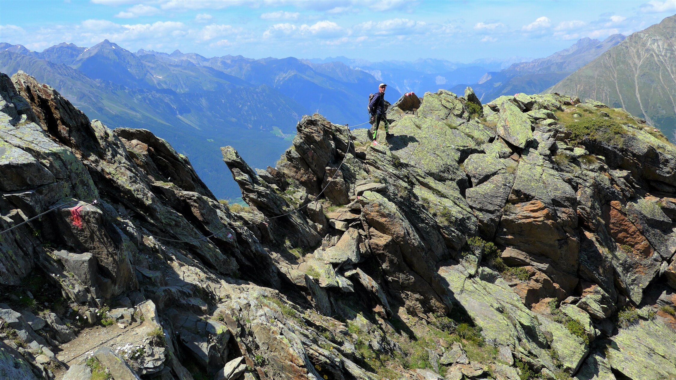 Der markierte Gamskogelsteig schraubt sich bald recht steil über die Nordostrippe zum riesigen Gipfelkreuz hinauf. Schwer ist die Route nicht. Einige Drahtseile sind dennoch zur Unterstützung für weniger Geübte angebracht. Der Blick in die grandiose Gletscherwelt der Stubaier Alpen entschädigt für die Schweissperlen des Aufstieges.