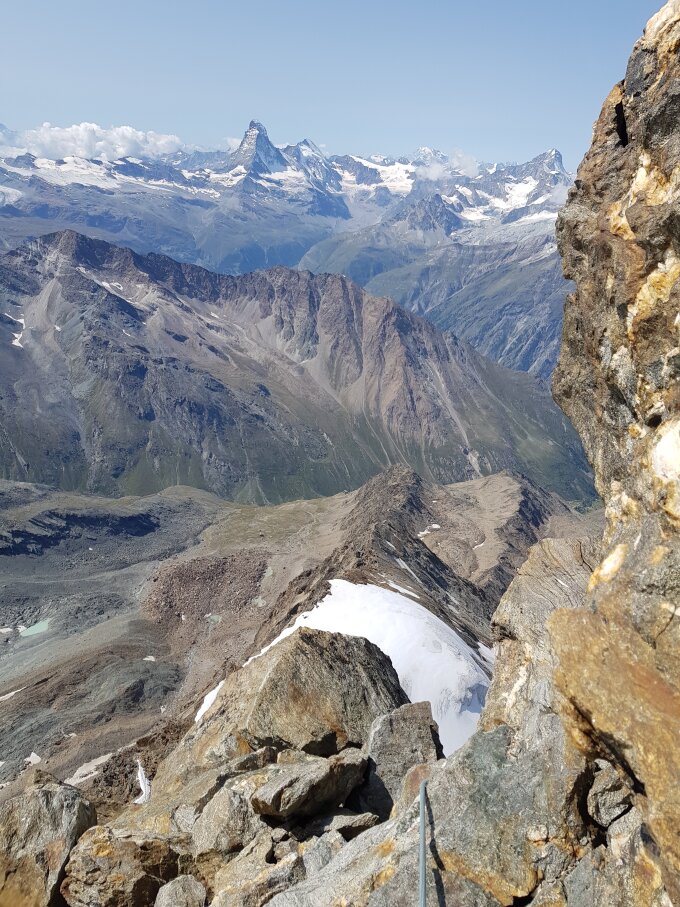 Abstieg vom Alphubel zum Mischabeljochbiwak teils im Schnee/Eis, teils Fels. Gute Tritte vorhanden aber Vorsicht geboten. Biwak perfekt ausgestattet - Danke dafür!