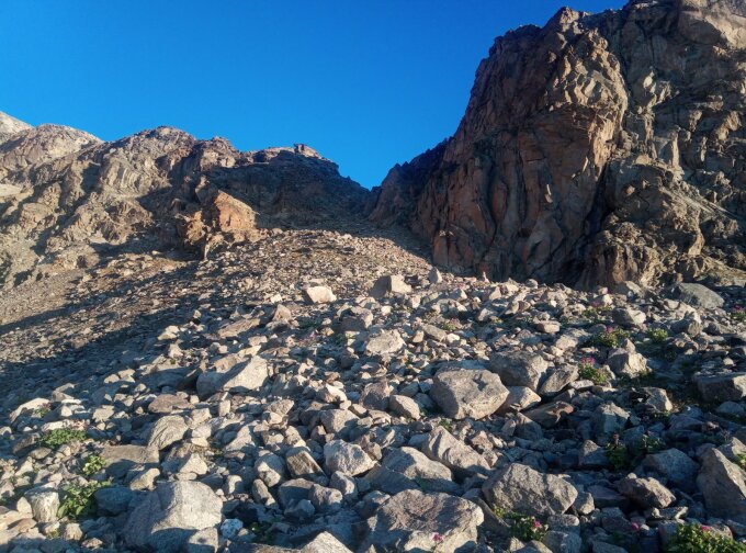Wir erwarteten ein gerölliges Coulour, fanden aber bis in den Sattel beinahe durchgehend einen schmalen Pfad vor.