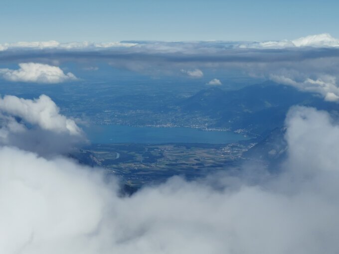 Vom Zeltplatz bis knapp unter den Pass sonnig. Ab Pass in den Wolken bis knapp unter den Gipfel. Sicht nur in nördlicher Richtung.