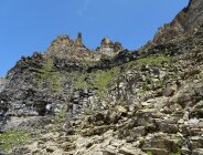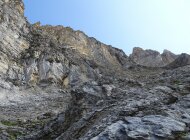 Abstieg über die Normalroute nach Norden über die Vordere Bütlasse, welche auch umgangen werden kann. Nach der Vordere Bütlasse bin ich zu früh westwärts ausgestiegen und habe mir dadurch eine unnötige Schlüsselstelle eingebrockt: triefnasse, fast senkrechte Felswand. Weil ein Haken mit alter Reepschnur drinhing, habe ich den Fehler erst im Nachhinein bemerkt. Ohne diese Hilfe wäre es nicht gegangen, aber auch so heikel.