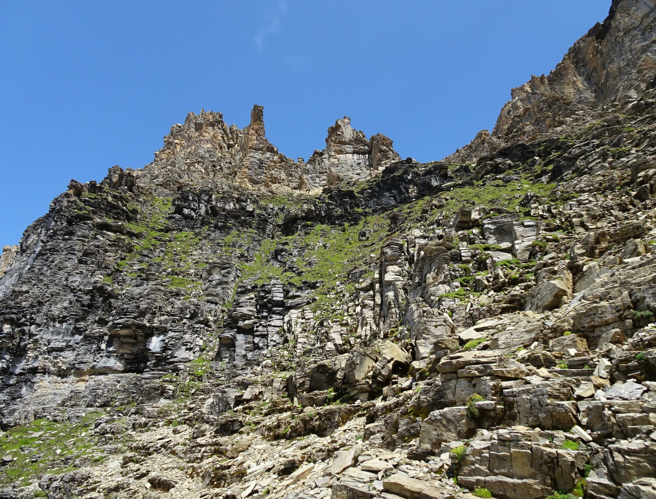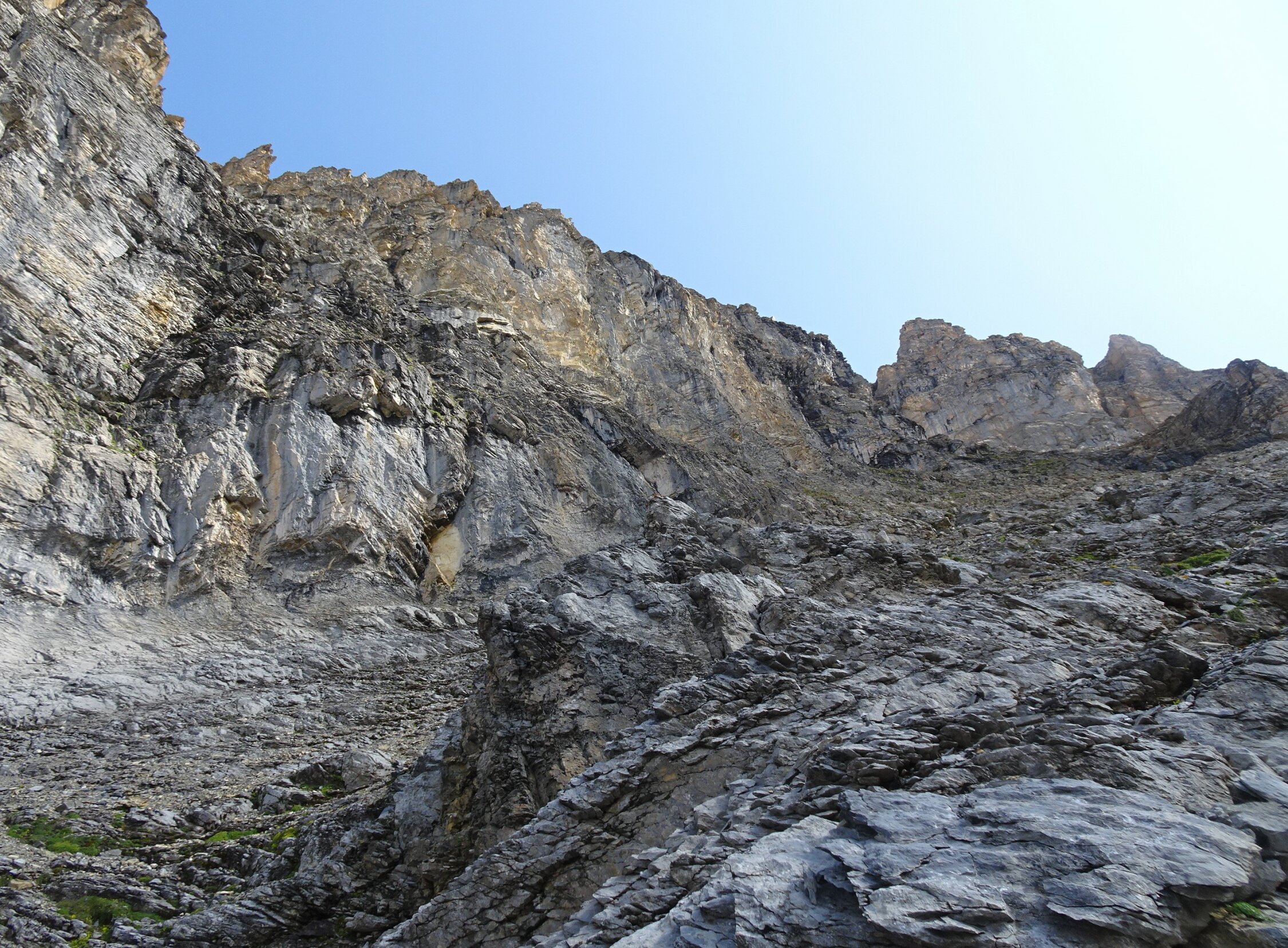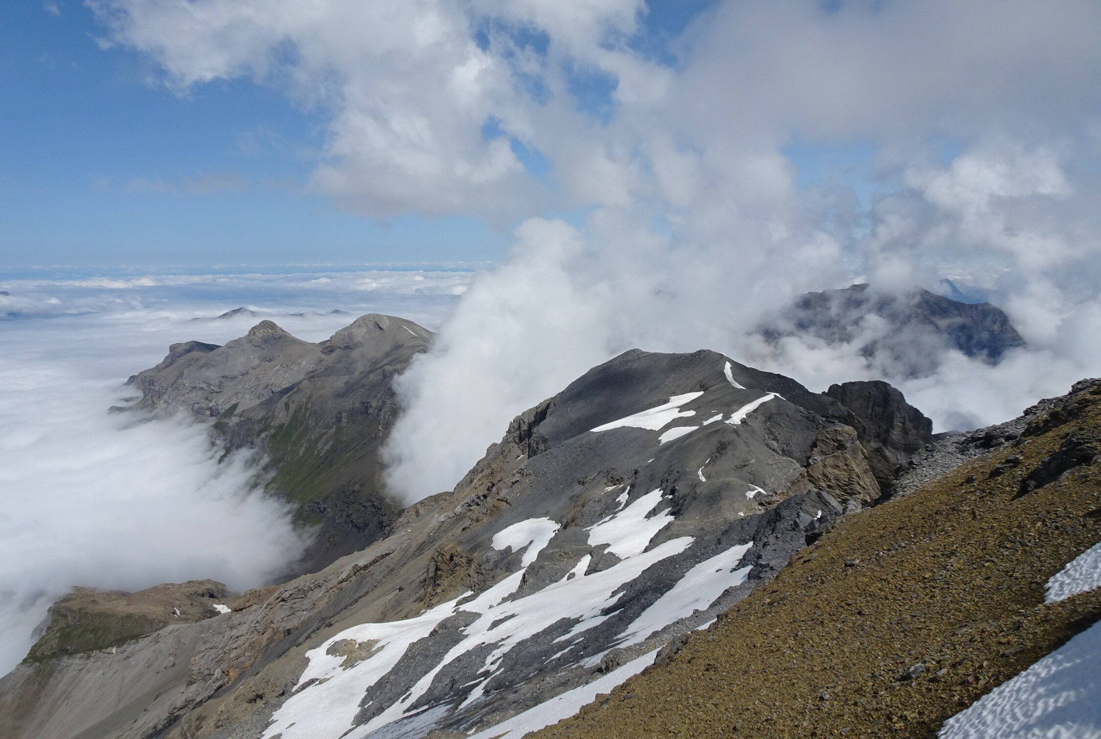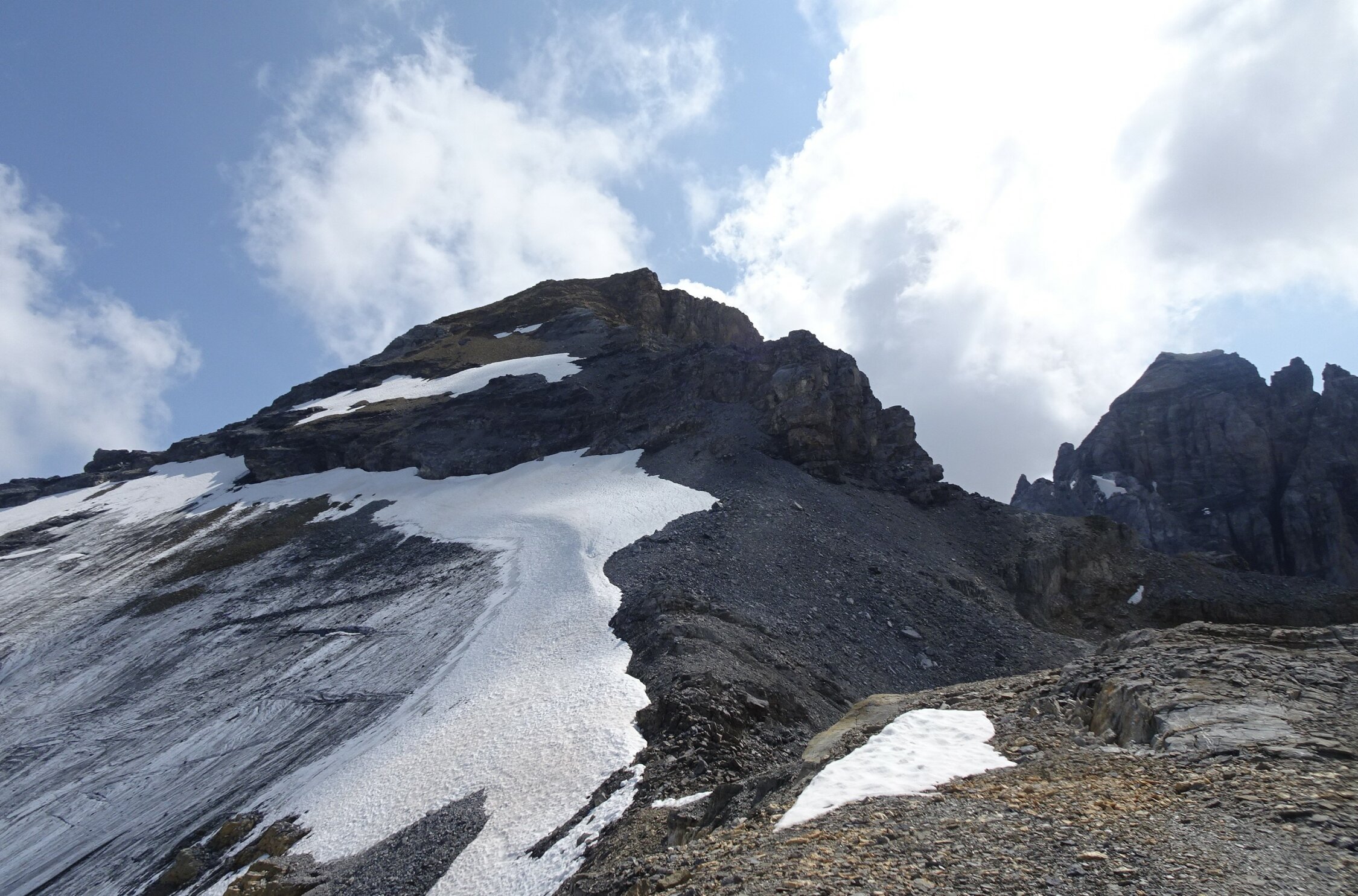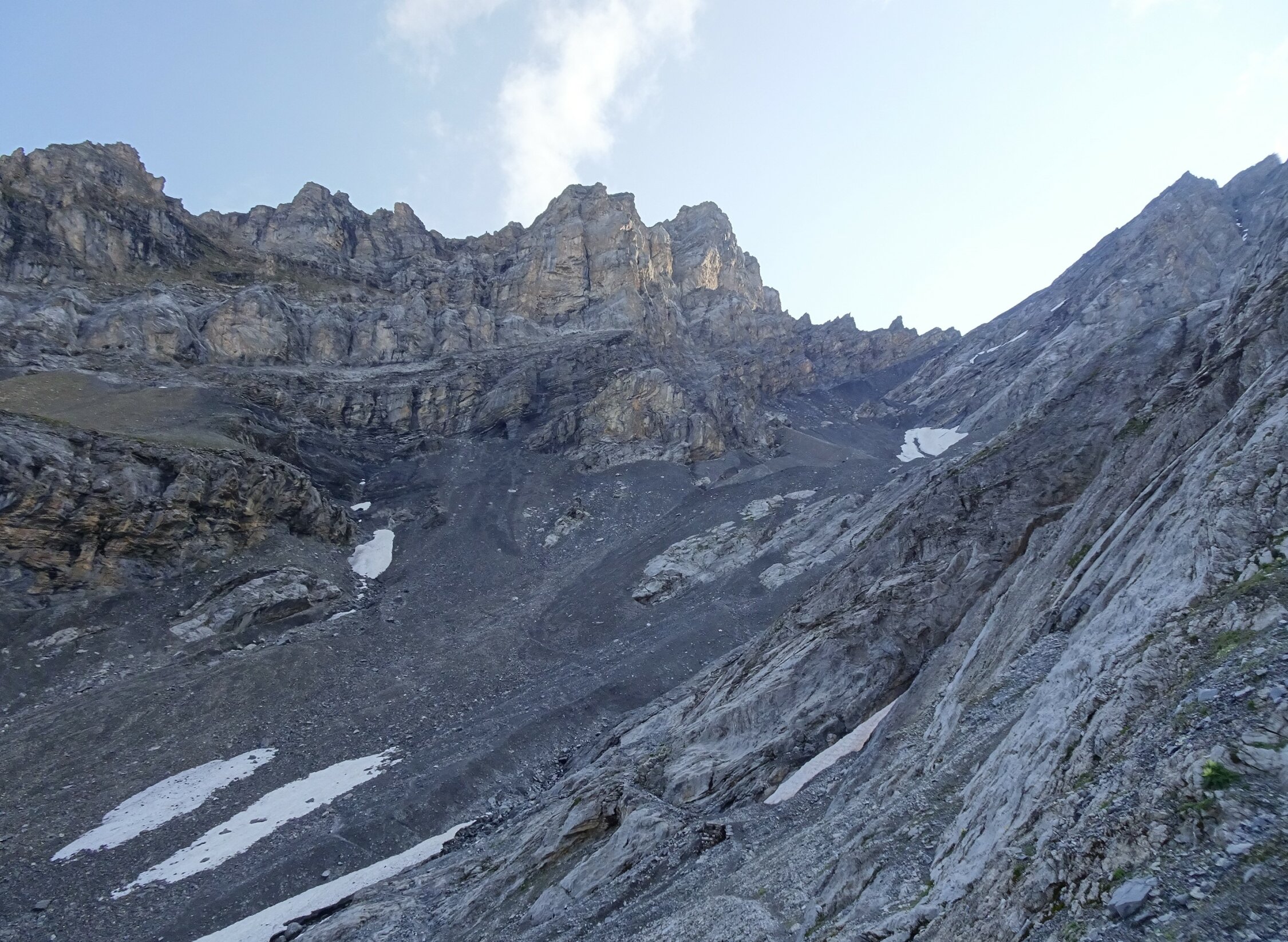 Da ich schon mal die 1000Hm zur Gspaltenhornhütte absolviert hatte, wollte ich das auskosten, deshalb im Anschluss die Bütlasse durch die selten begangene SW-Flanke bestiegen (T6-). Auch dort alles furztrocken, aber streckenweise sehr mühsam zu gehen (Geröllhorror!). Für die Routendetails verweise ich auf den exzellenten Beschrieb im SAC-Tourenportal.