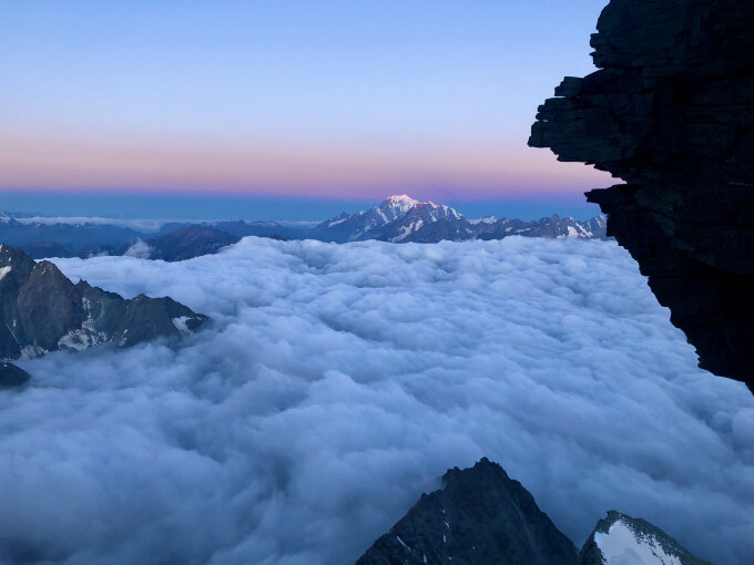 Die Verhältnisse am Berg sind top. Der Grat ist schneefrei und trocken, Steigeisen braucht man nicht. Der Gletscher im Gipfelbereich ist zugedeckt und dank den tiefen Temperaturen schön hart.