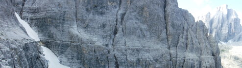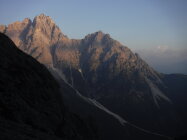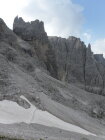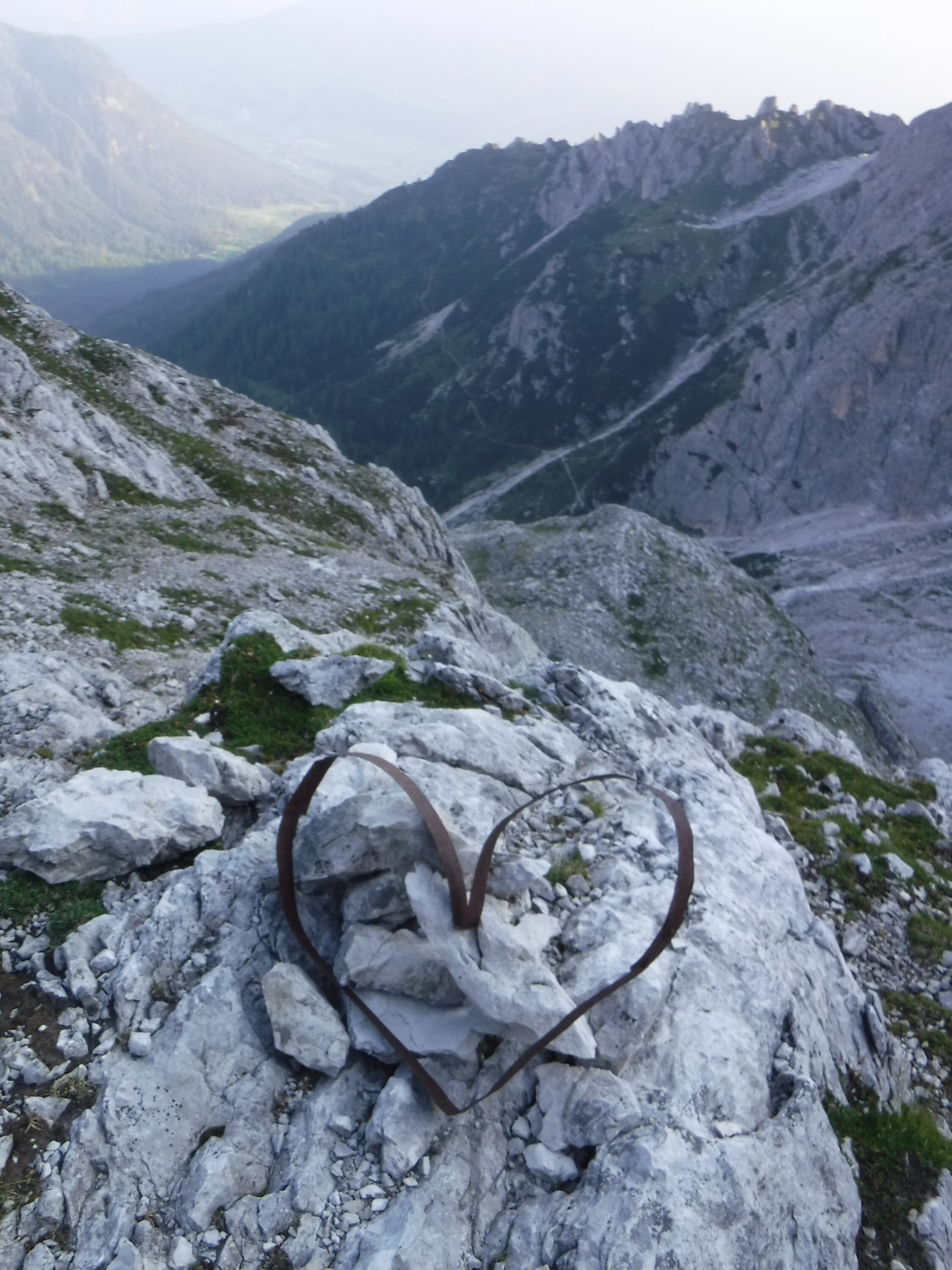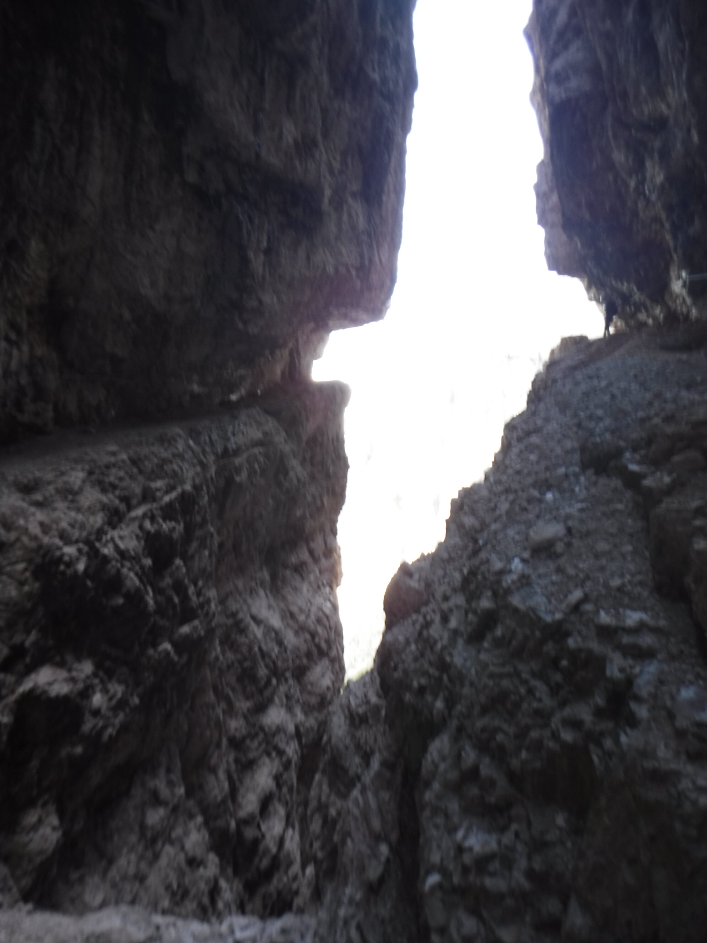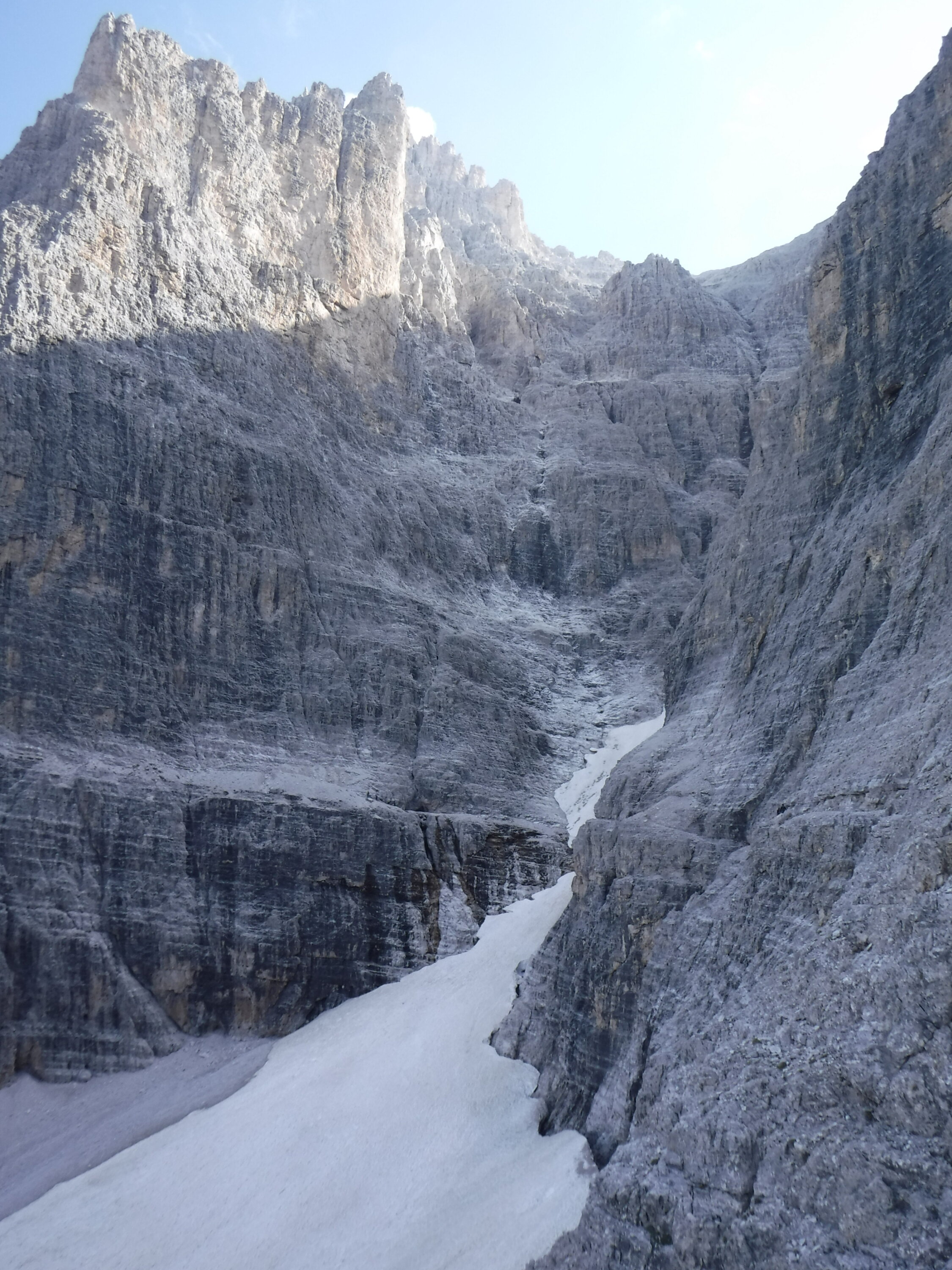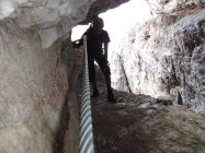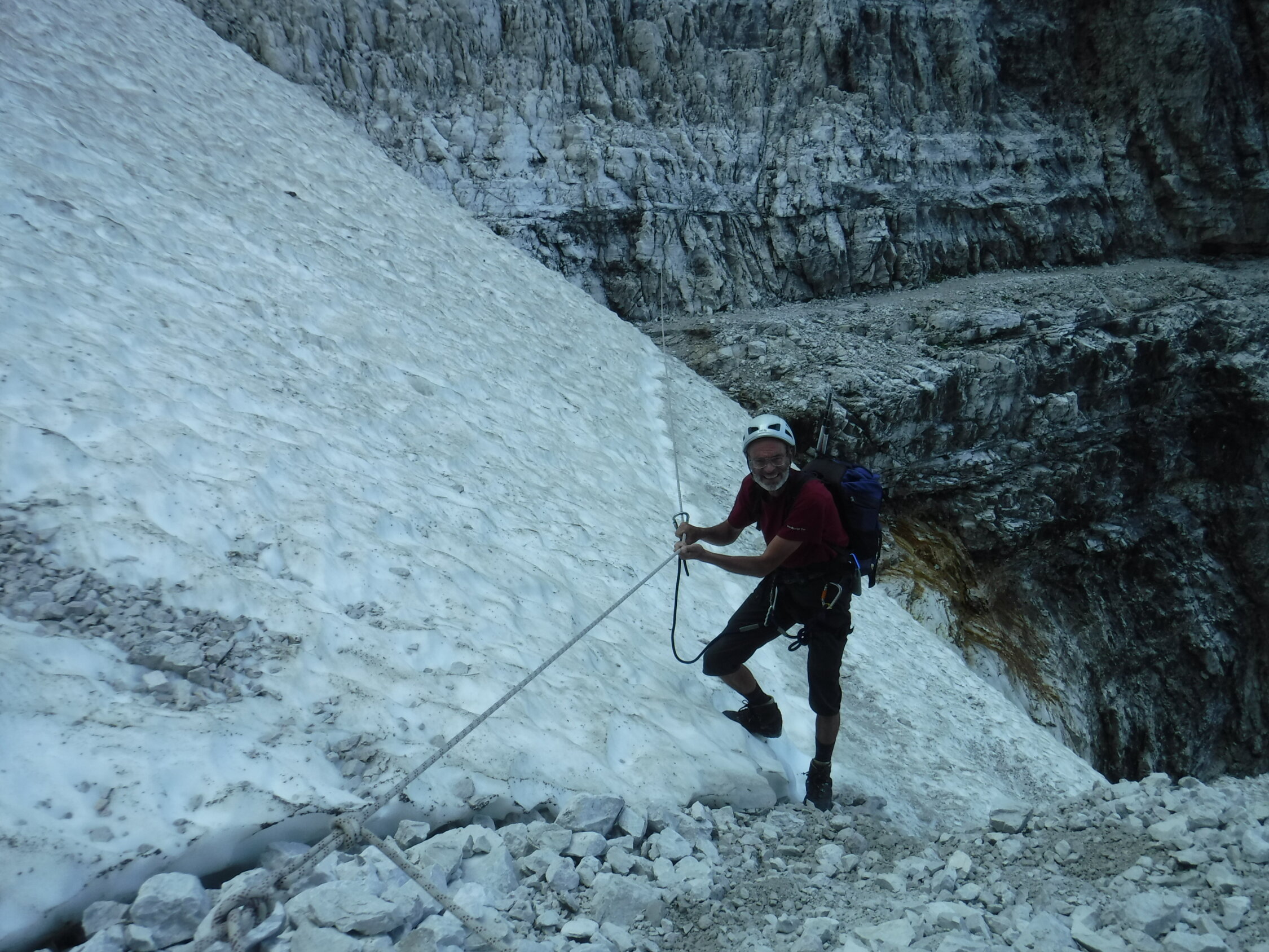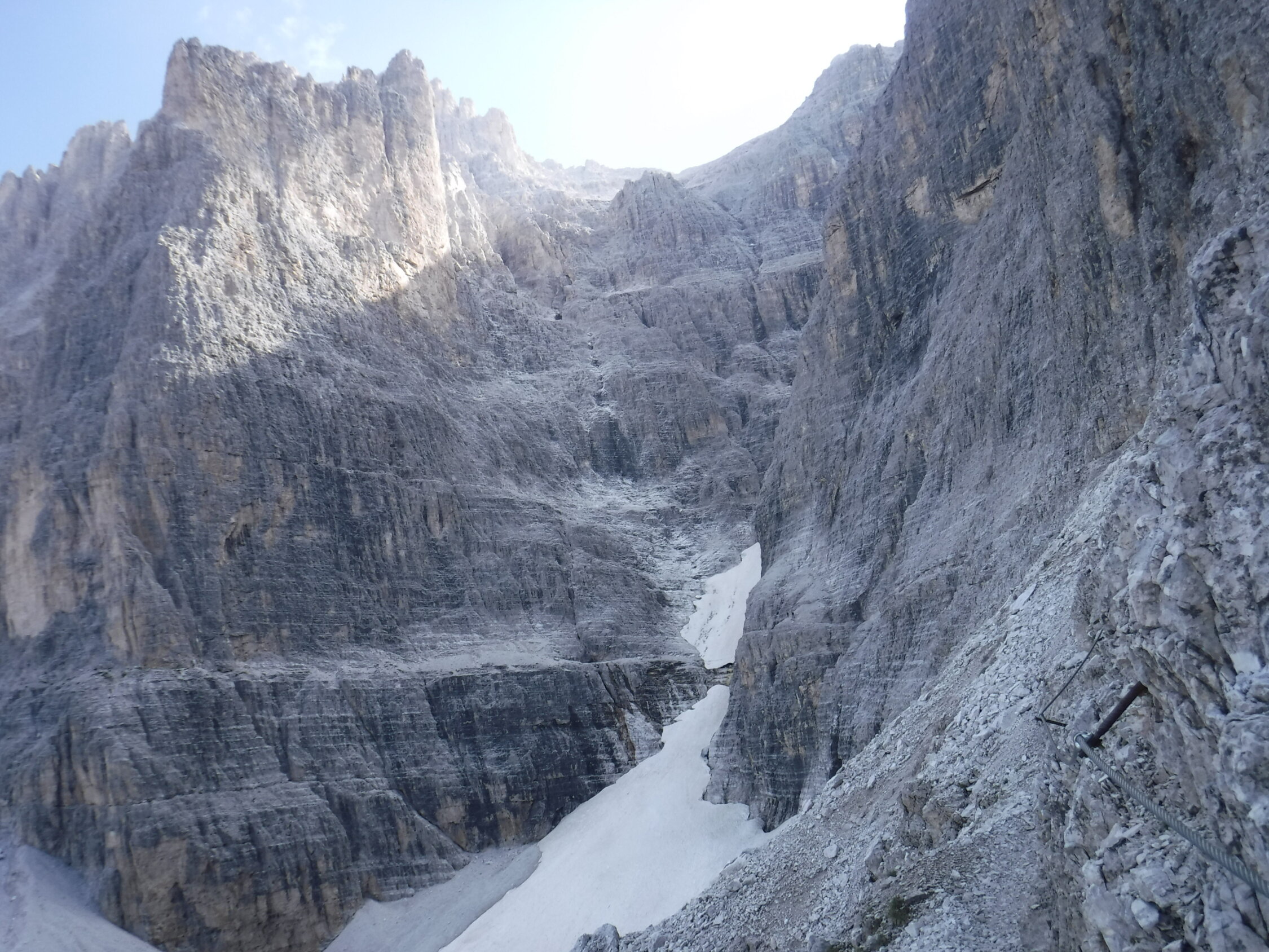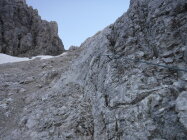 Tourenbeginn um 03:35 Uhr bei 12°C. Im Alpinisteig gab es noch 4 bombenfeste kurze Altschneefelder, die zu queren waren. Vorletztes in einer Felsbucht war mit einem Textilseil gesichert. Das letzte in dem spektakulären Spalt, in welchem sogar das vorheige Textilseil vom Schnee noch nicht freigegeben war, hatte noch mal ein neues darüber hängen. Zwar hatte ich Steigeisen dabei (wegen geplanter Fortsetzung über die Ferrata Roghel), benötigte diese aber hier nicht, dank vorhandener Halteseile.