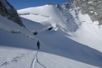 /Abstieg/: Gute Spur, teils scharfer Firngrat, 3x20 m am Grat abseilen, dann 20m auf das kleine Schneefeld (auf ca. 3580) und nochmals 20-25 m auf den Felsplatten am Felsrücken auf ca. 3400m.