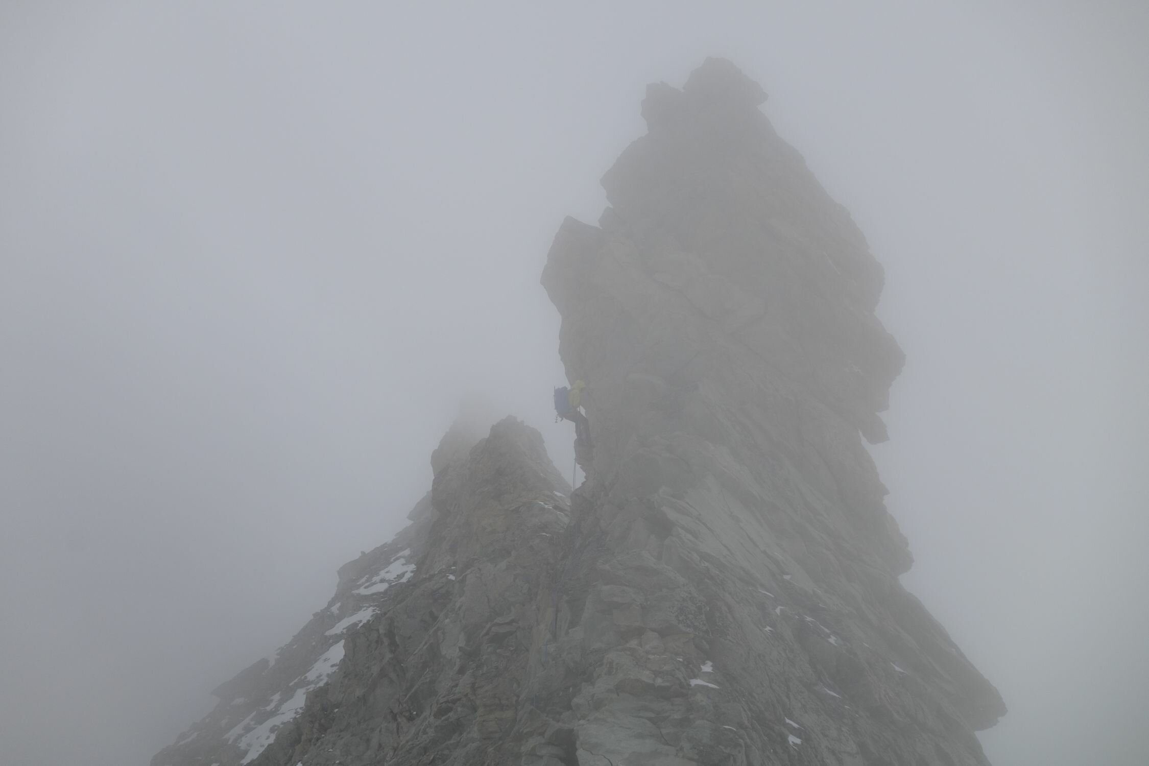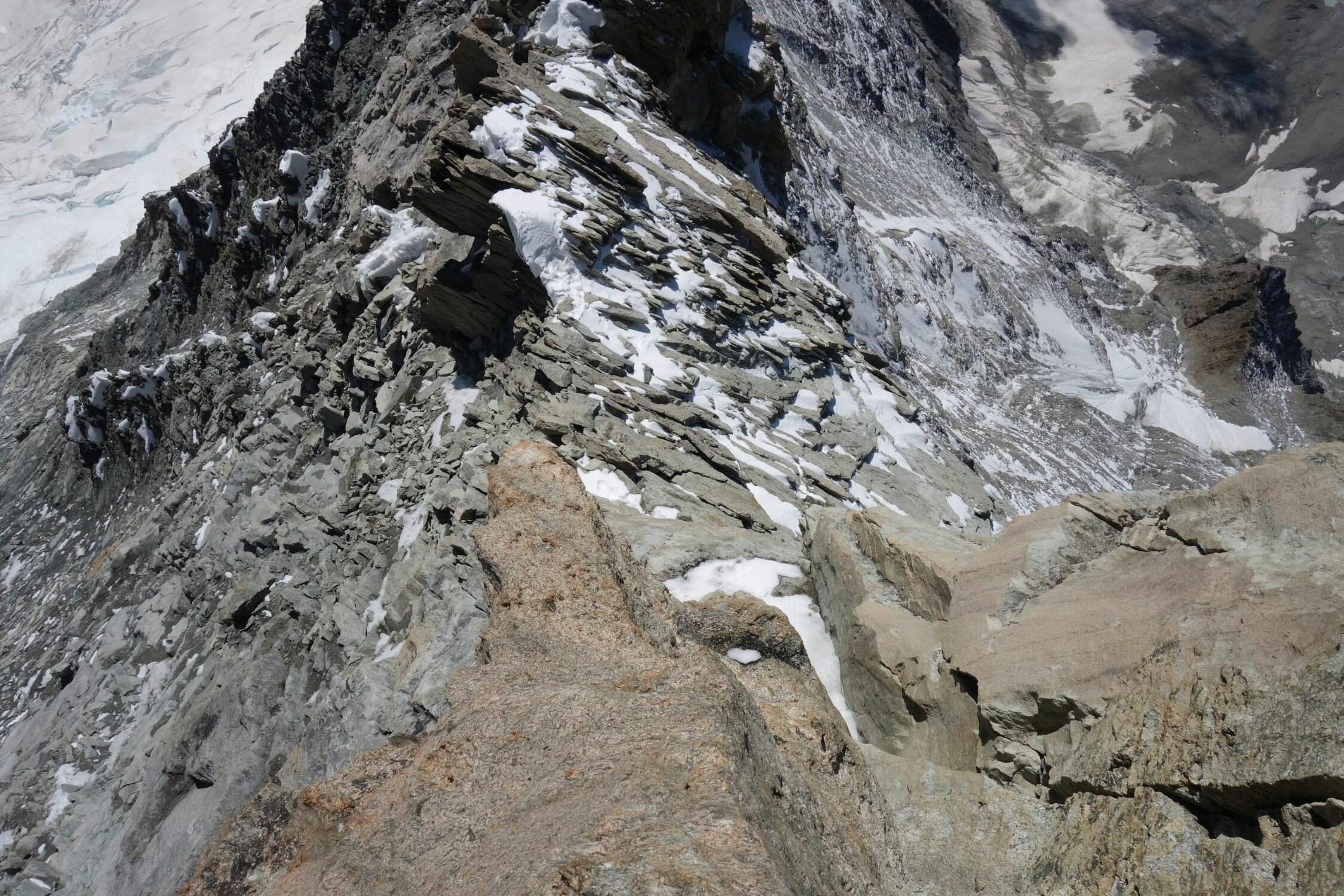 - Im Weisshorn-Ostgrat (Abstieg) teils sehr scharfer Firngrat der kaum ein Fuss breit ist.