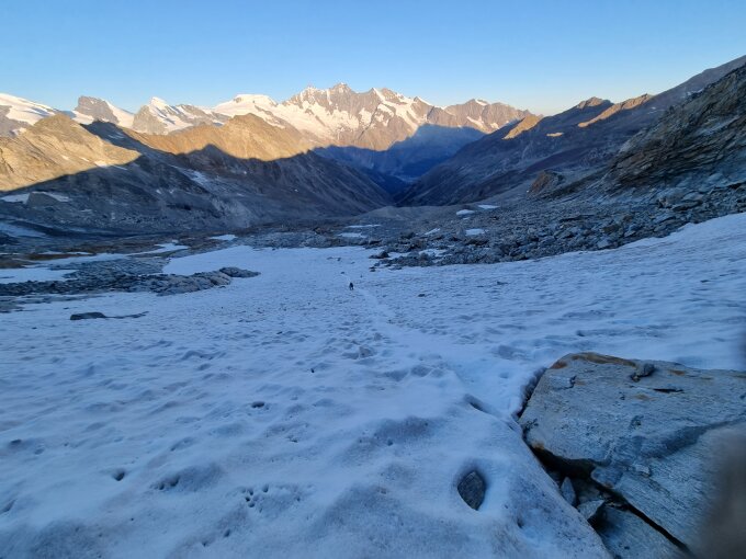 Schneefeld beim Einstieg gut ohne Steigeisen machbar, Fels trocken, griffig, schnerfrei, Abseilstelle gut zu finden, Schneefeld auf dem Rückweg zur Hütte gut zu umgehen oder in angenehmem Trittschner runter zu rutsch-laufen. Steinmännli markieren den Weg gut zurück durch die Steinfelder