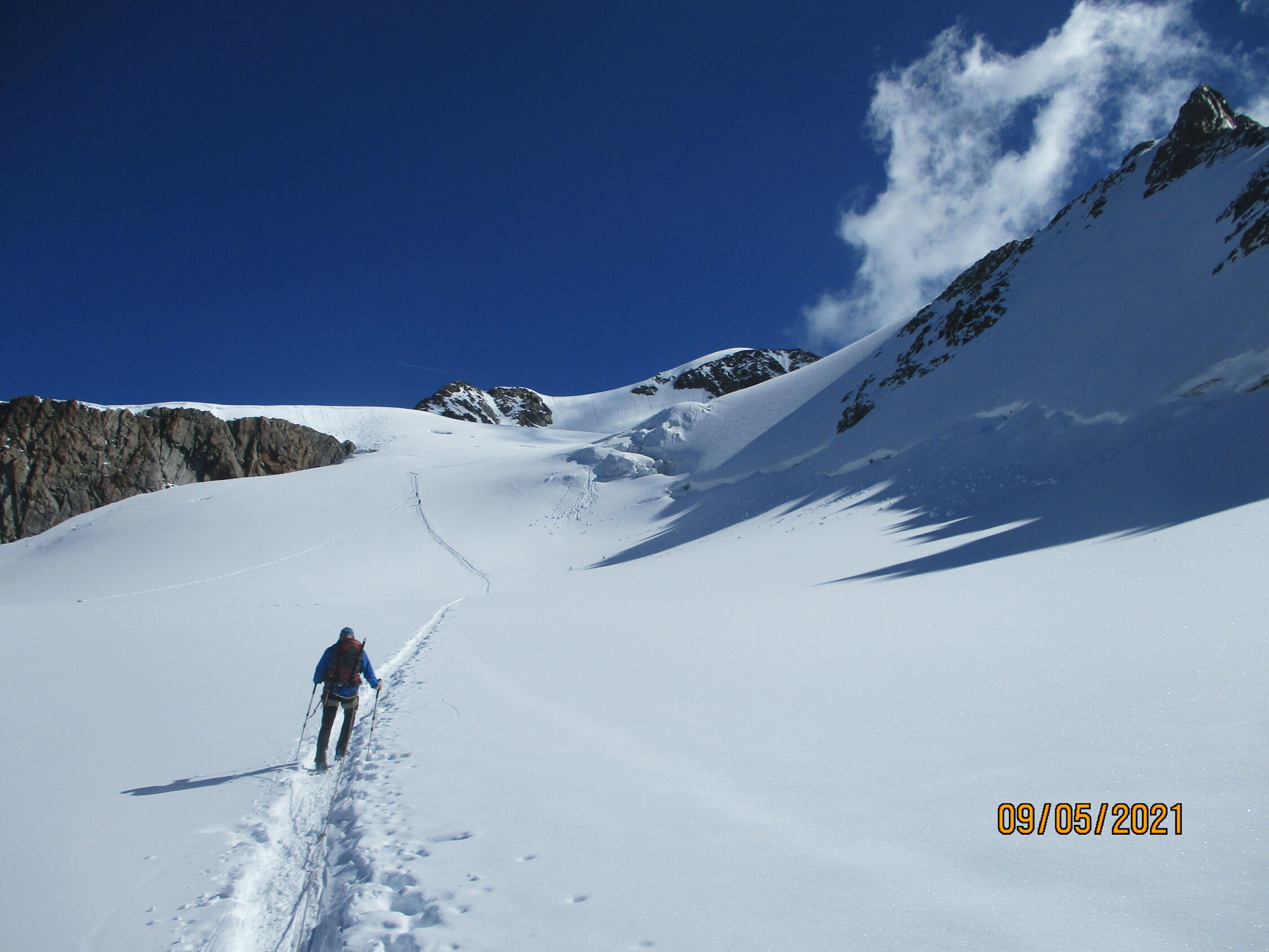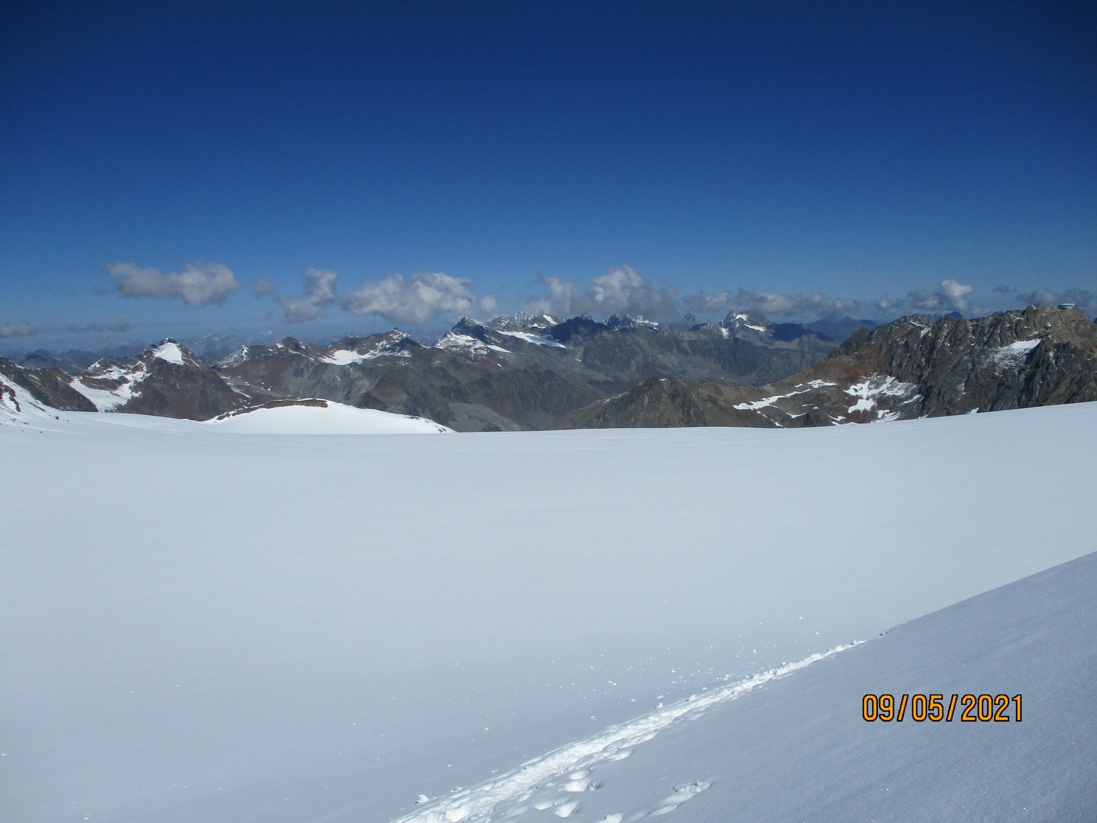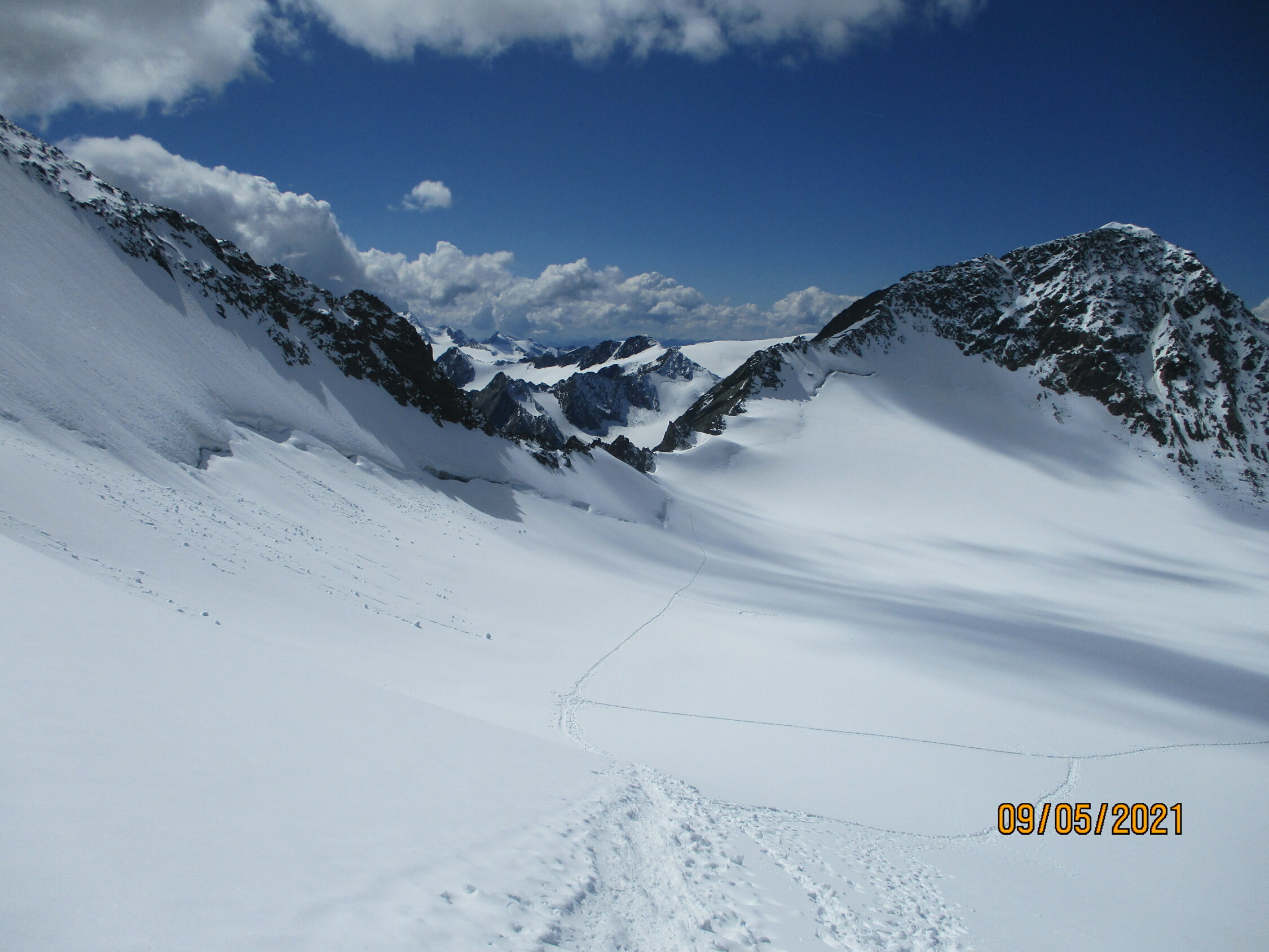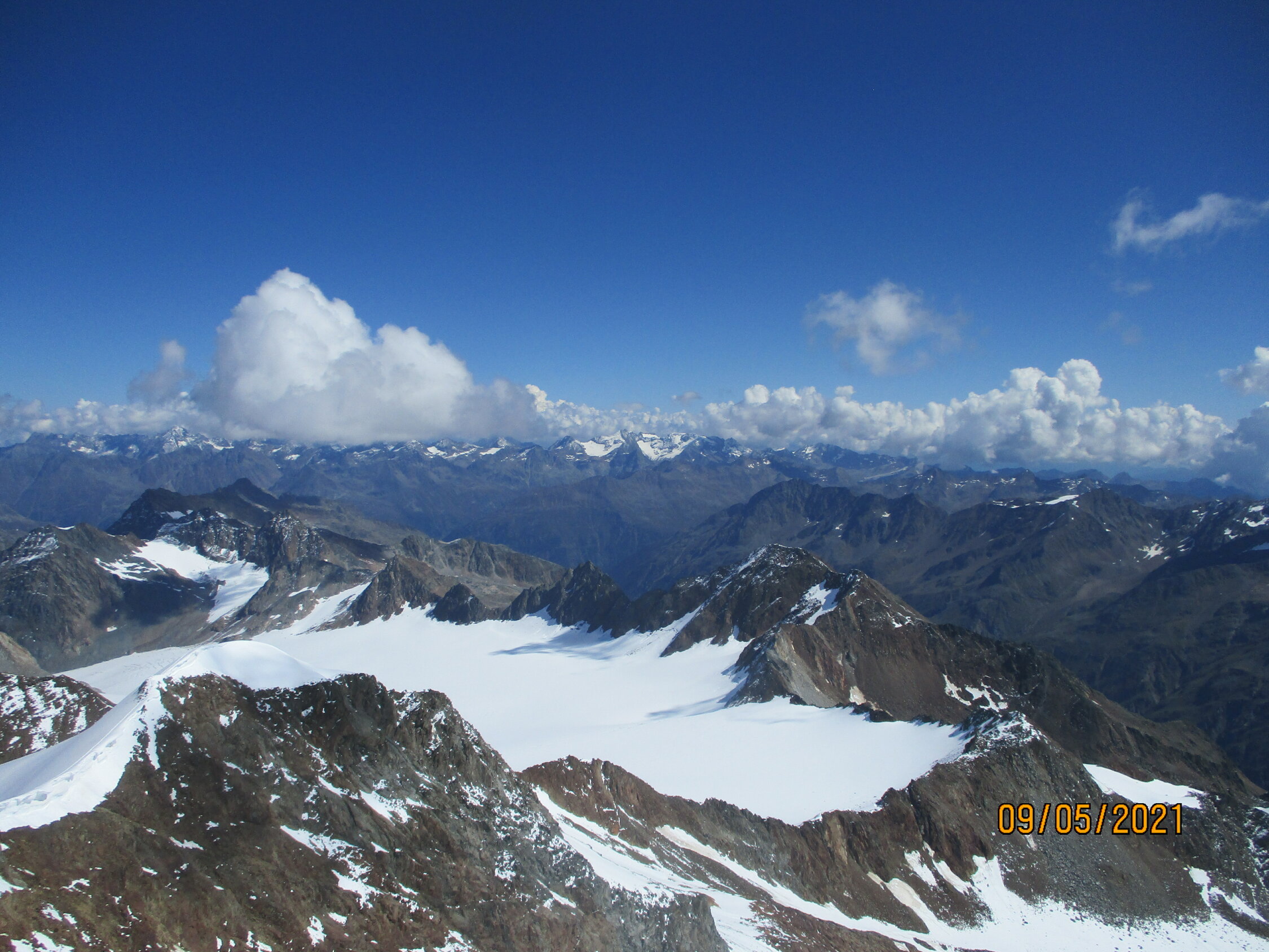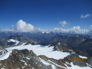 Hervorragende Verhältnisse! Angenehme Spätsommertemperaturen, großartige Weitsichten (außer nach Süden - Ortler & Co. blieben z.B. von Wolken verdeckt), Gletscher gespurt, durchgefroren und gut gedeckt. In An- und Abstieg durch das Couloir ins Mitterkarjoch sind in der steilen Firnflanke Steigeisen von Vorteil, dort schimmert teilweise das Blankeis durch. Erstaunlich wenige Personen unterwegs, die erste Gruppe trafen wir erst, als wir den Anstieg unterm Mitterkarjoch erreicht hatten.
