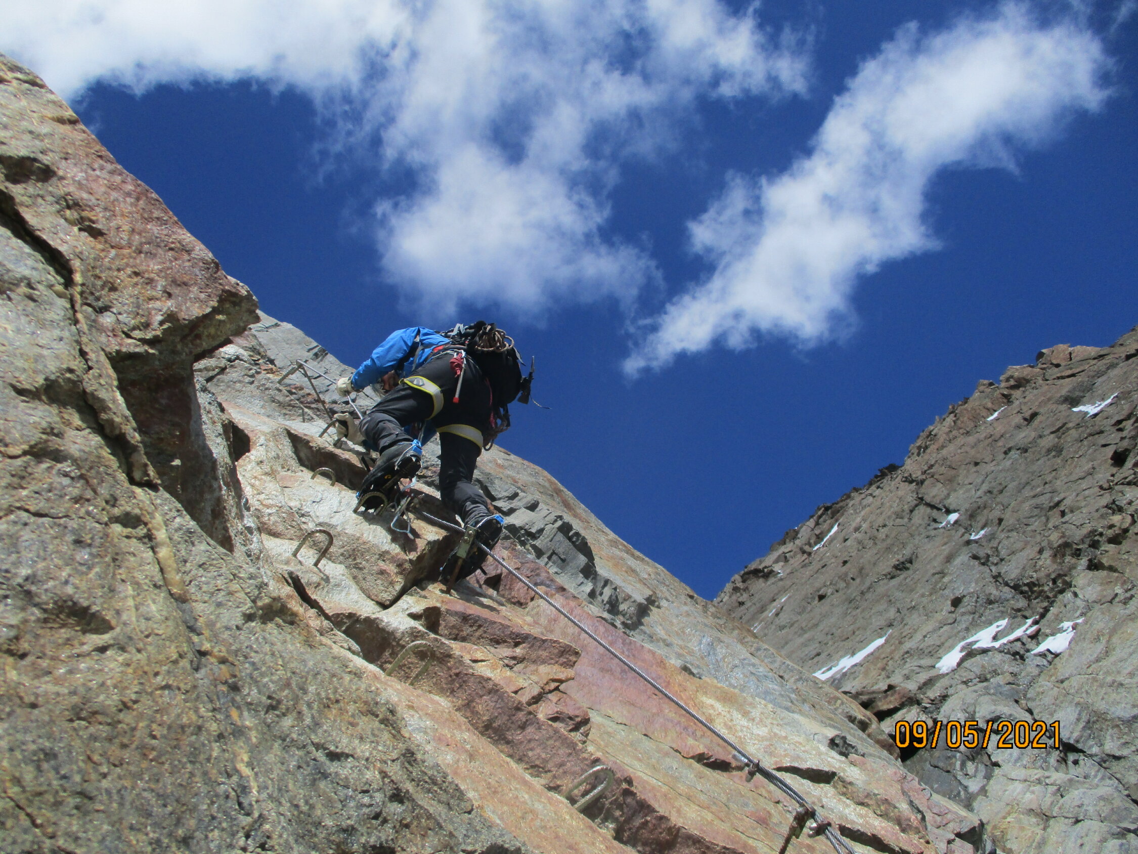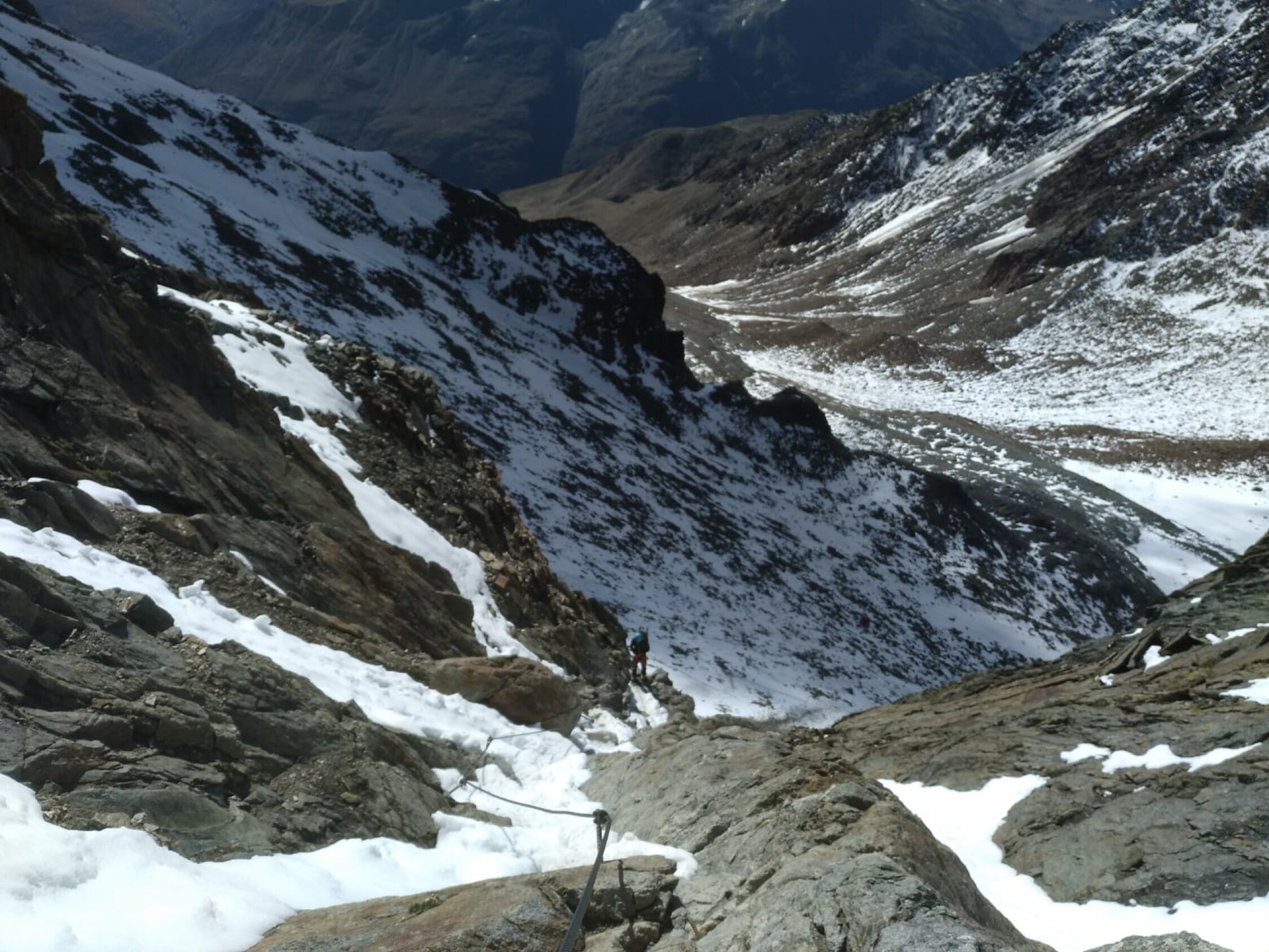 Leider ereignete sich heute in besagtem Firncouloir unterm Mitterkarjoch ein tödlicher Unfall, der auch uns sehr betroffen macht. Wir waren zuvor im Klettersteig mit der bereits absteigenden Gruppe zusammengetroffen und hatten auch kurz Kontakt.