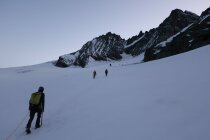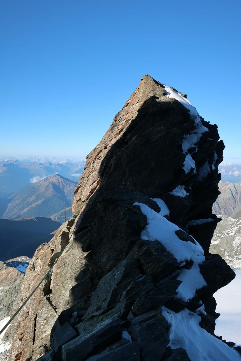 Zustieg gut im Firn machbar bis zur Rampe. Westseitig teilweise noch Schnee und/oder Eis auf den Felsen, aber immer gut machbar oder zu umgehen. Kletterei süd/ostseitig im trockenen Fels.