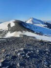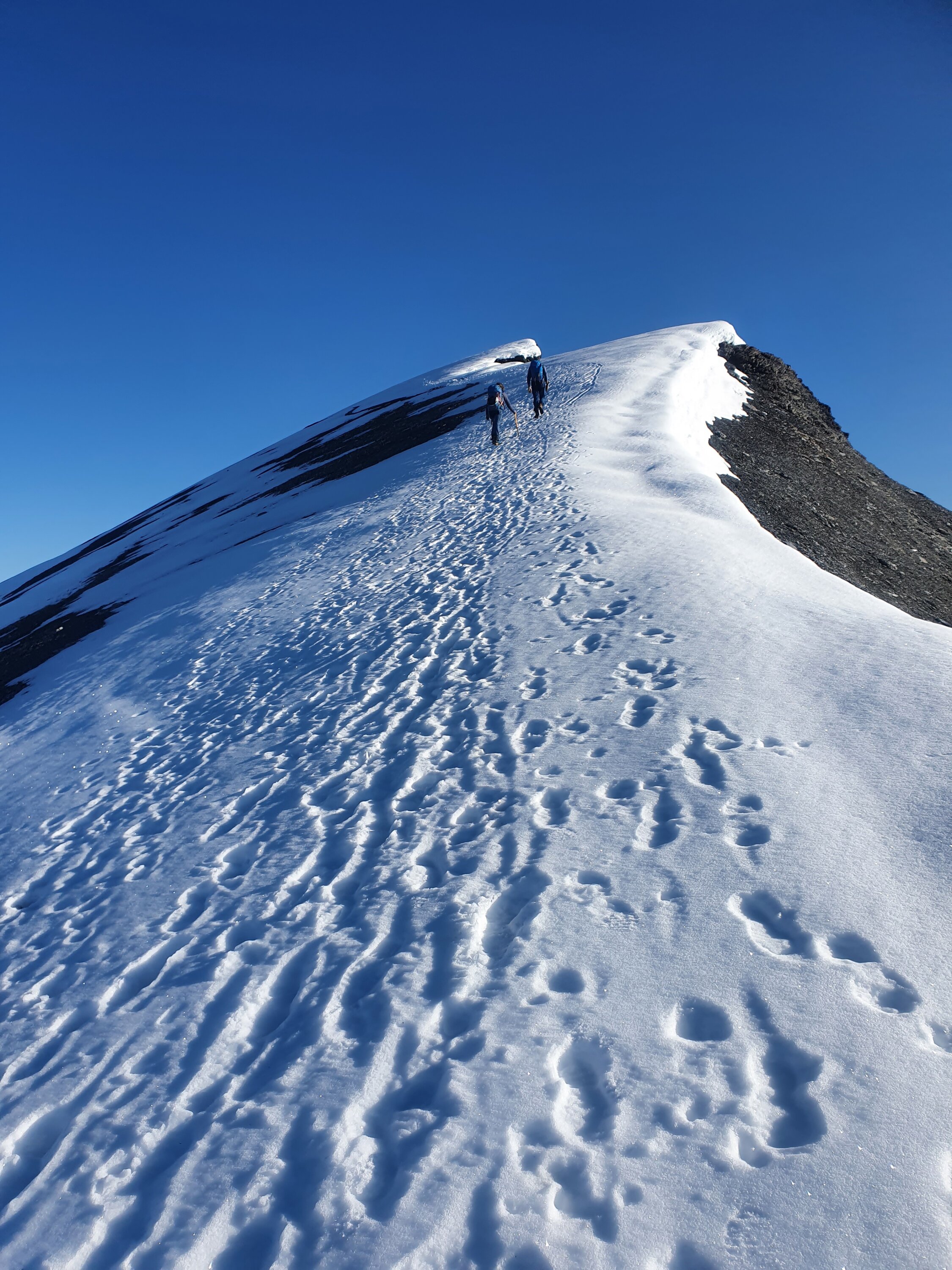 Wieder am Depot entschieden wir uns dafür, die Steigeisen einzupacken. Tatsächlich war der weitere Verlauf der Tour -bis auf den ersten Rücken bis ins Surenjoch- praktisch komplett schneebedeckt. Ohne Steigeisen wären der steile Aufstieg vom Surenjoch zu P. 3038 und die Querung auf dem Grat zum Piz Segnas nicht möglich gewesen. Oben angelangt, konnten wir auch die Wegspuren auf dem aperen Grat für den Abstieg nach Elm sehen -steil und ausgesetzt erfordert diese Route absolute Trittsicherheit.