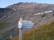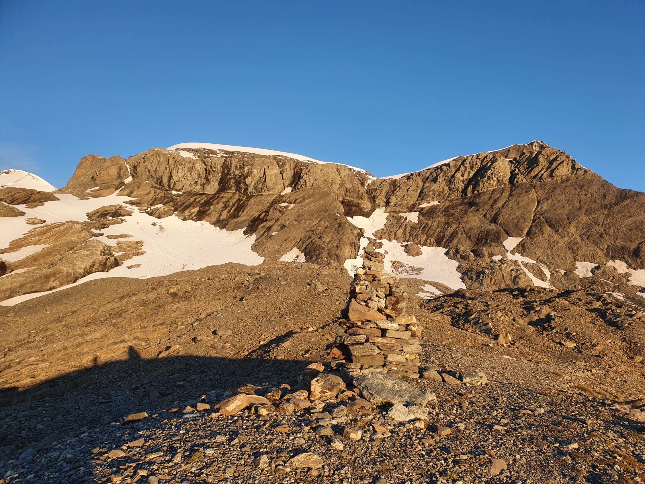 Kurz nach 6 Uhr an der Hütte noch im Halbdunkel gestartet freuten wir uns über den gut sichtbaren Wegweiser Richtung Mittelgrat bei P 2328. Auf dem Plateau des früheren Sardonagletschers angekommen, wären wir beinahe der Versuchung erlegen, den Spuren im Schnee Richtung Südwesten zu folgen. Tatsächlich erfolgt aber der weitere Aufstieg auf Wegspuren (ab und zu Steinmannli) zum Mittelgrat. Die Karte suggeriert noch eine Überquerung des Surengletscher, der aber inzwischen so weit zurückgegangen ist, dass wir ohne Schneeberührung an den Grat und dort weiter über besagte Wegspuren und dann entlang der Drahtseile bis ca. 2900m in einfacher Kraxelei aufgestiegen sind. Der Mittelgrat war schneefrei.