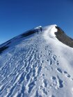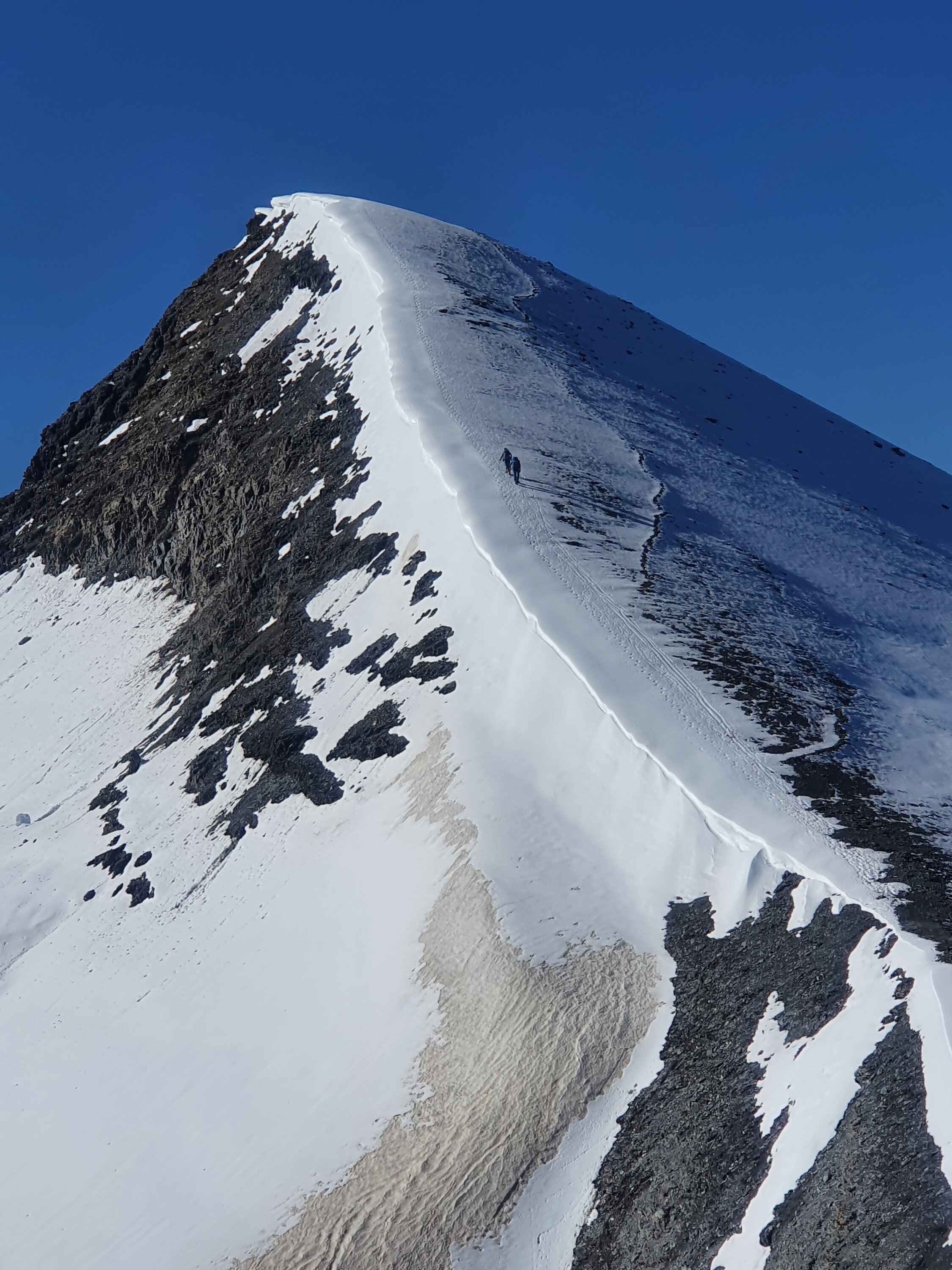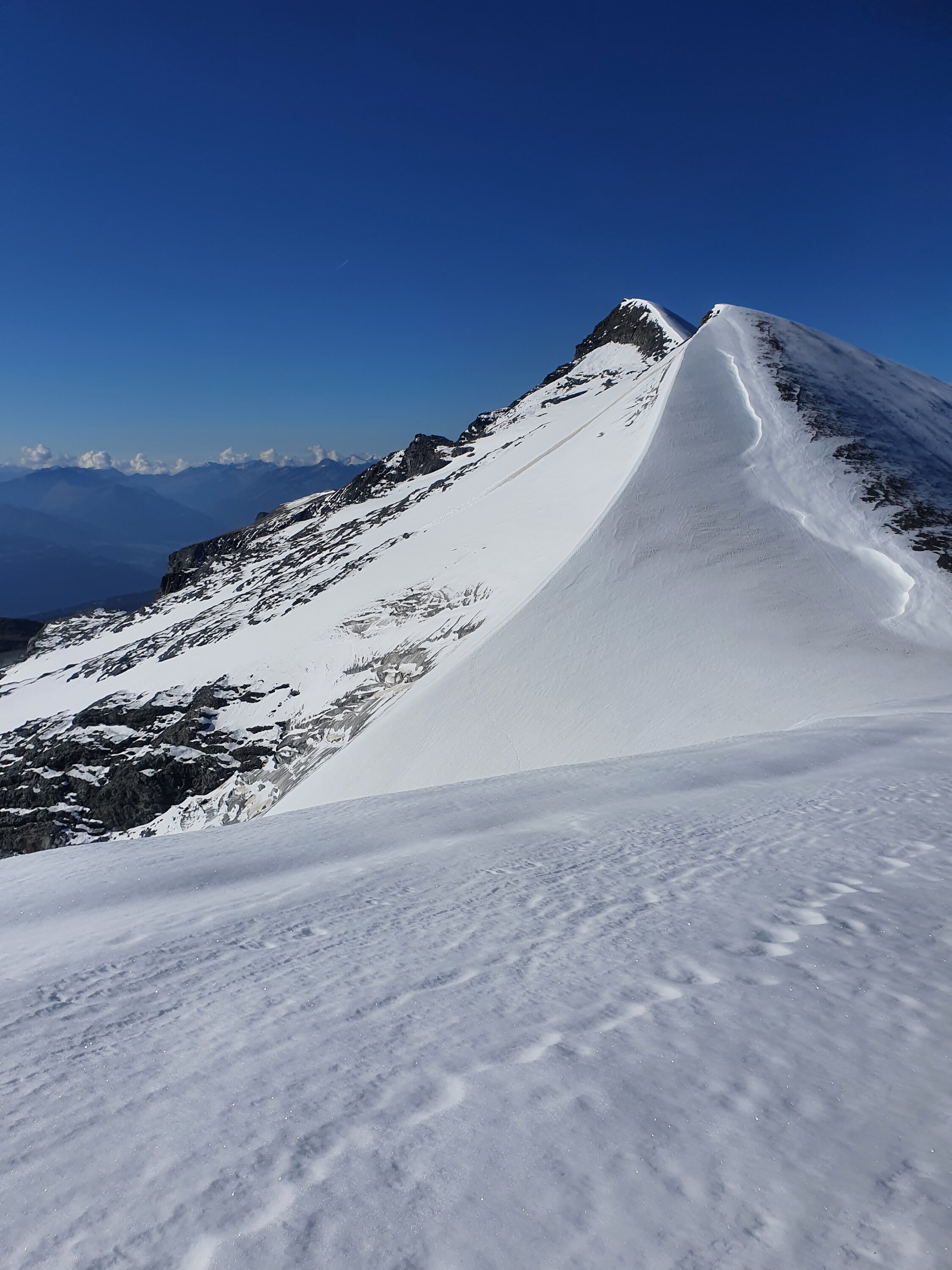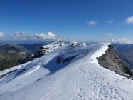 Oben war der Schnee noch etwas hart und tatsächlich auch der gesamte Grat bedeckt, liess sich aber ohne Steigeisen begehen bis zum Piz Sardona. Deshalb haben wir auch Steigeisen und Seil (das wir übrigens auf der ganzen Tour nicht benutzt haben) deponiert und sind nur mit Pickel ausgerüstet auf dem Grat zum Gipfel aufgestiegen. Um ca. 9h waren wir am ersten Gipfel für den Tag. Die in Anbetracht der totalen Einsamkeit da oben etwas überraschende autobahnähnliche Spurenlage erklärte sich offenbar durch eine große Gruppe vom Vortag. Wir jedenfalls genossen komplett alleine den Blick in die Tiefe, zu den Glarnern und rüber zu unserem zweiten Tagesziel, dem Piz Segnas.