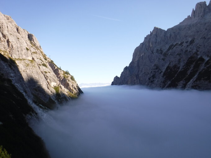 Tourenbeginn um 07:00 Uhr bei 10°C und im Hochnebel, über den man nach 2 Stunden hinauskam bei der Zsigmondy-Comici-Hütte. Mittags dann typische Sommer-Quellwolkenbildung, welche die Fernsicht behinderten.