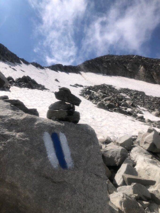 Neu ist der Weg im oberen Teil entlang der Steinmännchen blau-weiss markiert, was den Aufgang vor allem auf der Ebene und im kurzen "Steilstück" (links des Schneefeldes) erleichtert. Perfekt, danke!