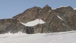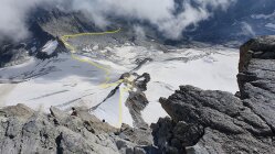 Der Einstieg in die Route ist zur Zeit etwas schwierig da das Firnfeld von einem Gleitschneeabgang aus dem Couloir eine grosse Scharte verpasst bekommen hat und zwar genau beim Einstieg. Es kann aber seitlich in die Route geklettert werden. Ist nur mit dem Schrund etwas unangenehm.