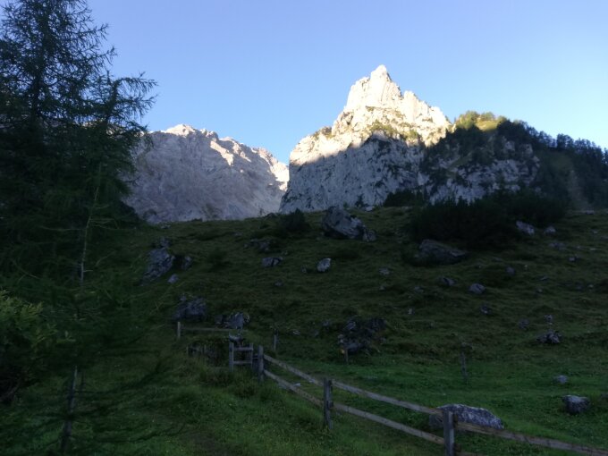 In der Nacht hatte es geregnet. Der Weg zur Sarottlahütte war zwischendurch recht feucht und somit etwas rutschig auf den Steinen. Der weitere Weg trocknete, dank der doch noch sommerlichen Temperaturen, recht schnell. Eigentlich ausgezeichnete Verhältnisse vorgefunden. Kurzes warten beim der Sohmplatte, aber grad recht für eine Trinkpause, und es ging schon los mit der Kletterei. Alles trocken am Fels.