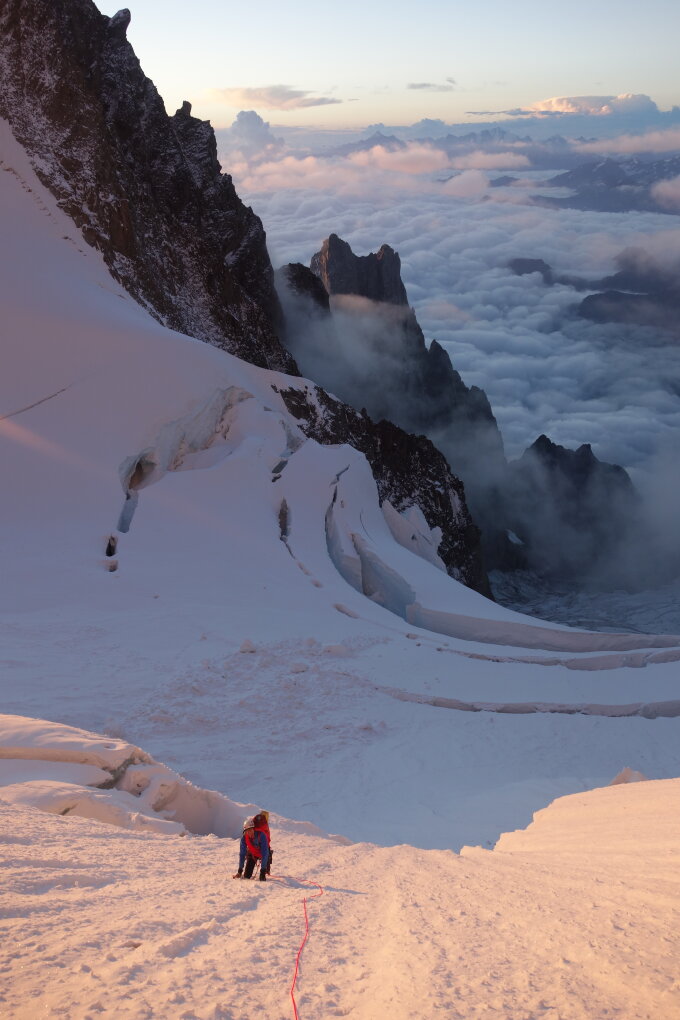Für mich der 4. Anlauf zu der Tour. Einmal Innominatagrat wegen zuviel Schnee, einmal umgedreht weil zu warm (Nullgratgrenze>4500m und brutaler Steinschlag am Pfeiler), einmal umgedreht weil das letzte Gewitter in der Nacht am Eccles Biwak statt wenigen cm doch mehr als 20cm runtergelassen hatte)