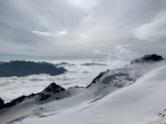 Beim Abstieg gibt es laut Topo zwei Möglichkeiten: Entweder eine 40 Grad steile Firnflanke hinunter (heikel, da unten grosse Spalte) oder über einen kurzen Felsgrat. Wir folgten erst dem Felsgrat, fanden aber keine sichere Möglichkeit, um von dort auf den Gletscher zu gelangen.
