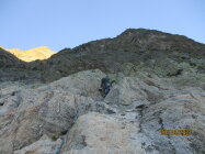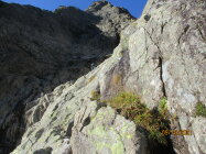 Die plattigen Felsen unmittelbar nach dem Einstieg bis zum Erreichen des Grates waren von zahlreichen Wasserschlieren durchzogen. Ich persönlich empfand dies als höchst unangenehm, zumal das Gemisch nasses Urgestein- Flechten einen wahren Schmierseifeneffekt erzeugt. Normalerweise 2a, musste daher häufig in schwierigeres Gelände ausgewichen werden. Dau kommt noch, dass in diesem plattigen Gelände kaum Absicherungsmöglichkeiten bestehen.