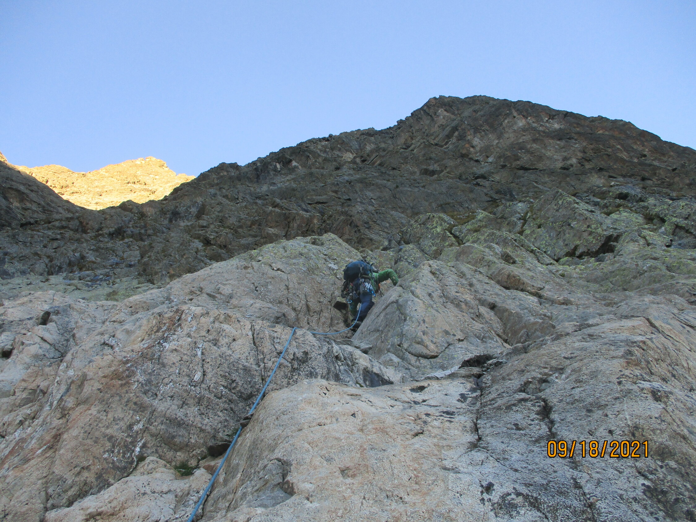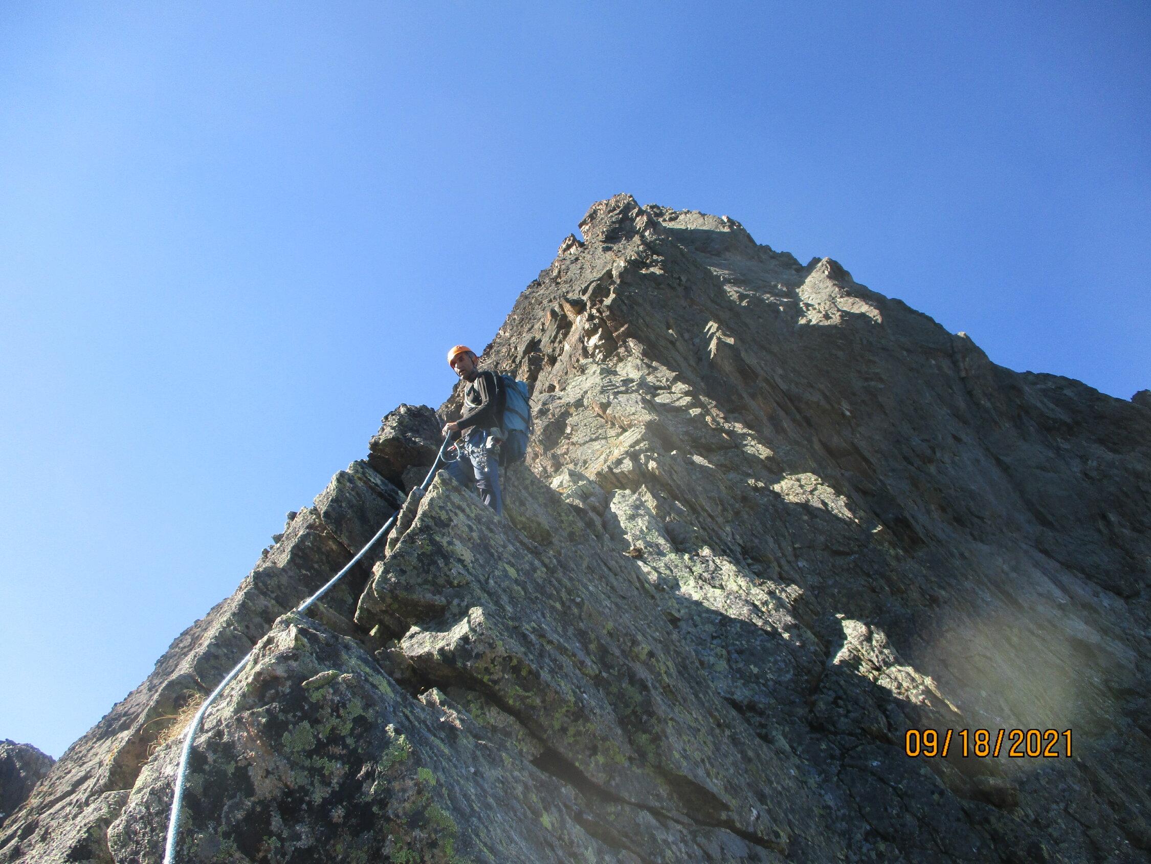 Die offiziell 26 SL müssen weitestgehend zu Zweit am Seil gegangen werden. Nur die schwierigeren Passagen werden mittels Stand gesichert, andernfalls würde man in arge Zeitbedrängnis kommen! Achtung: beim Abstieg über die Normalroute sich nicht durch Pfadspuren und Steinmännchen zu tief in die Flanke hineinleiten lassen, sondern vermutlich direkt aus der Scharte zwischen Haupt- und Südgipfel zu Letzterem ansteigen, bevor es eindeutiger weitergeht.