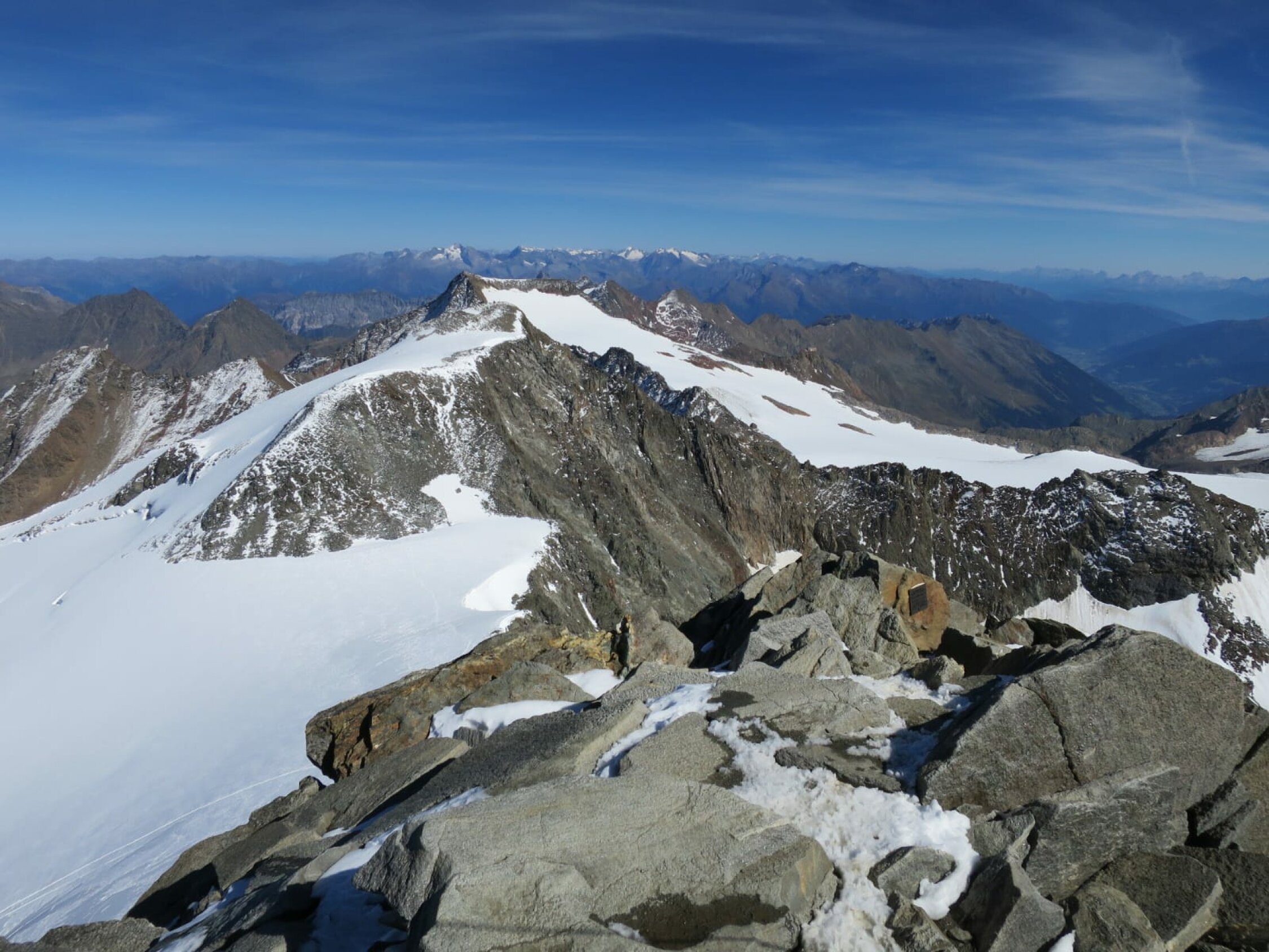 Am Sonntag dann noch auf den Wilden Freiger aufgestiegen. Man kann sehr weit über den Gletscher hoch und muss nicht schon am Becherhaus auf den Grat. Das letzte Stück über teilweise wenig feste Drahtseile zum Signalgipfel hoch ist komplett trocken.