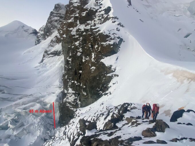 Wir sind uber Schwartor/Schwärzegletscher abgesteigen, ein 45m Abseilen über einen Eisbruch brachte uns schließlich auf die 20m breite Rampe. Nach dem Abseilen ist es leicht hoch zu kommen. (siehe bild)