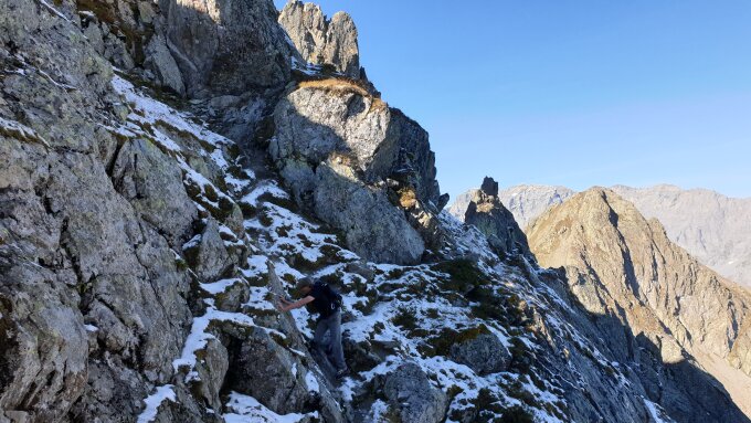 Am Ruchälplistock nordseitig wenig Schnee und z.T. vereist. Wir hatten Steigeisen bzw. Spikes dabei