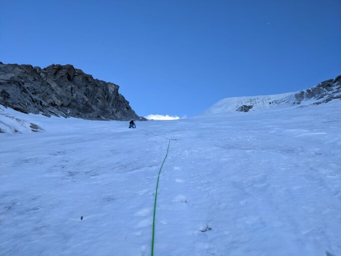 Bergschrund mit Schraube im Eis gut machbar.
